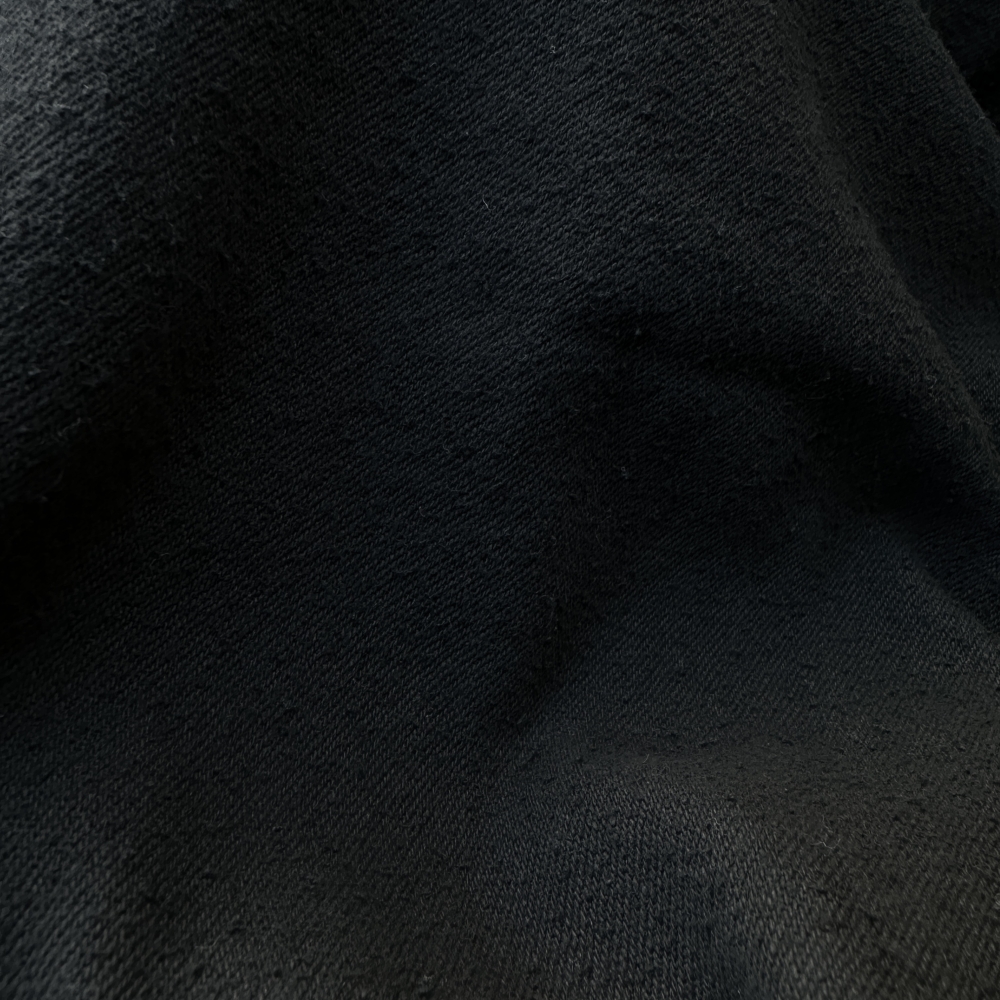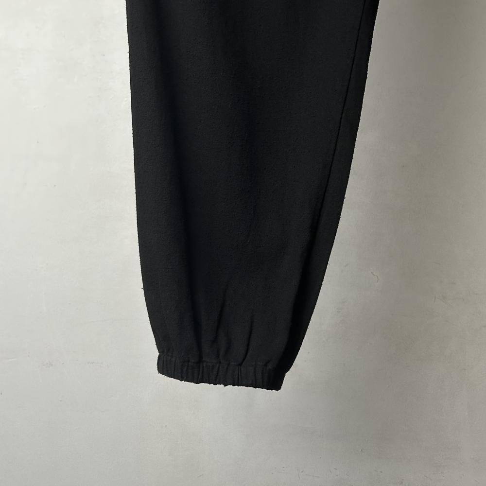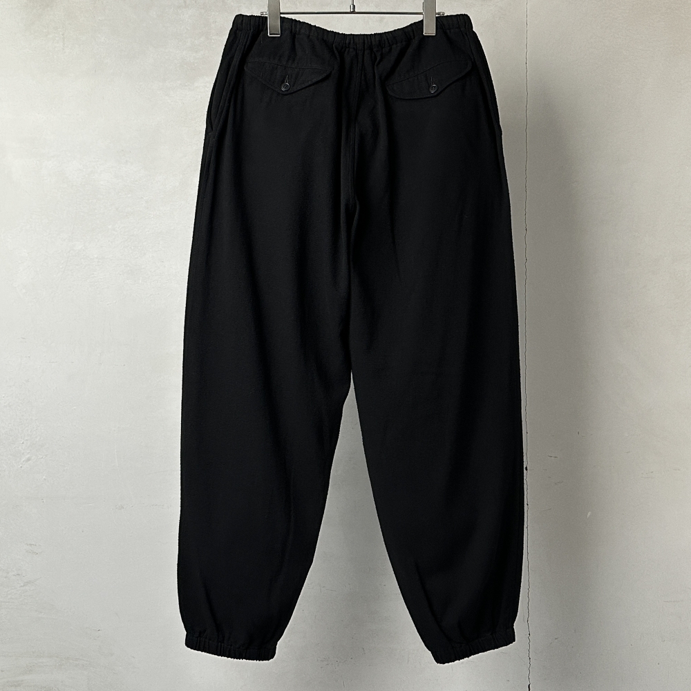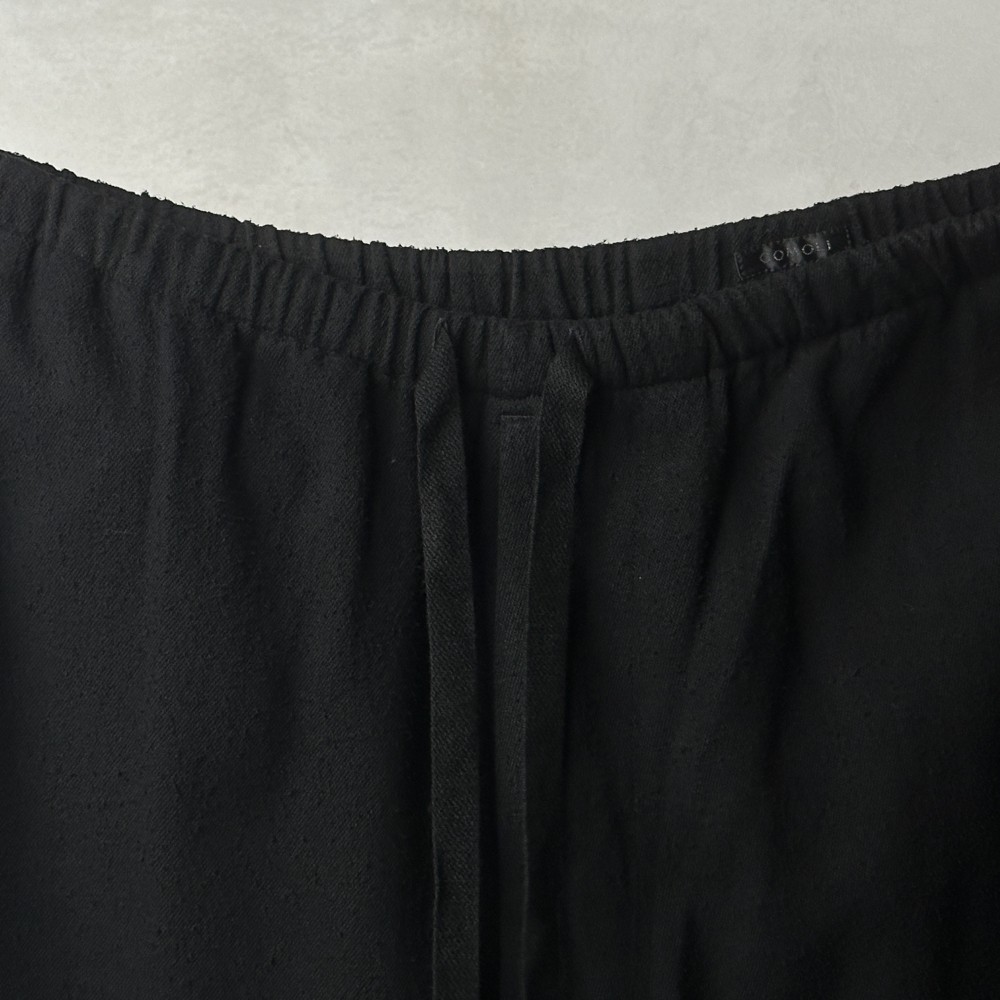 シルクネップの静かな個性が印象的なドローストリングパンツ。通常の黒いシルクネップ生地にブラウンの製品染めを施し、微かにサンフェードの気配を感じさせるような趣のあるブラックカラーに仕上げています。膝巾を持たせ腰から裾へと流れる豊かなアウトラインは、やがて裾ゴムのクッションによって緩急のあるシルエットを演出します。軽く柔らかなシルクは吸湿性や放湿性に優れ、湿度・気温の上昇が課題となるシーズンに適した素材。着用と洗いを繰り返すことで徐々にネップが取れ落ち、スムースな顔つきに変化していく特性を持つこの生地は、他をもって代え難い魅力に満ちています。様々なアイテムに合わせやすく、SSラインナップの土台を支えるパンツの筆頭にして、COMOLIを深く理解する上で欠かせない存在です。