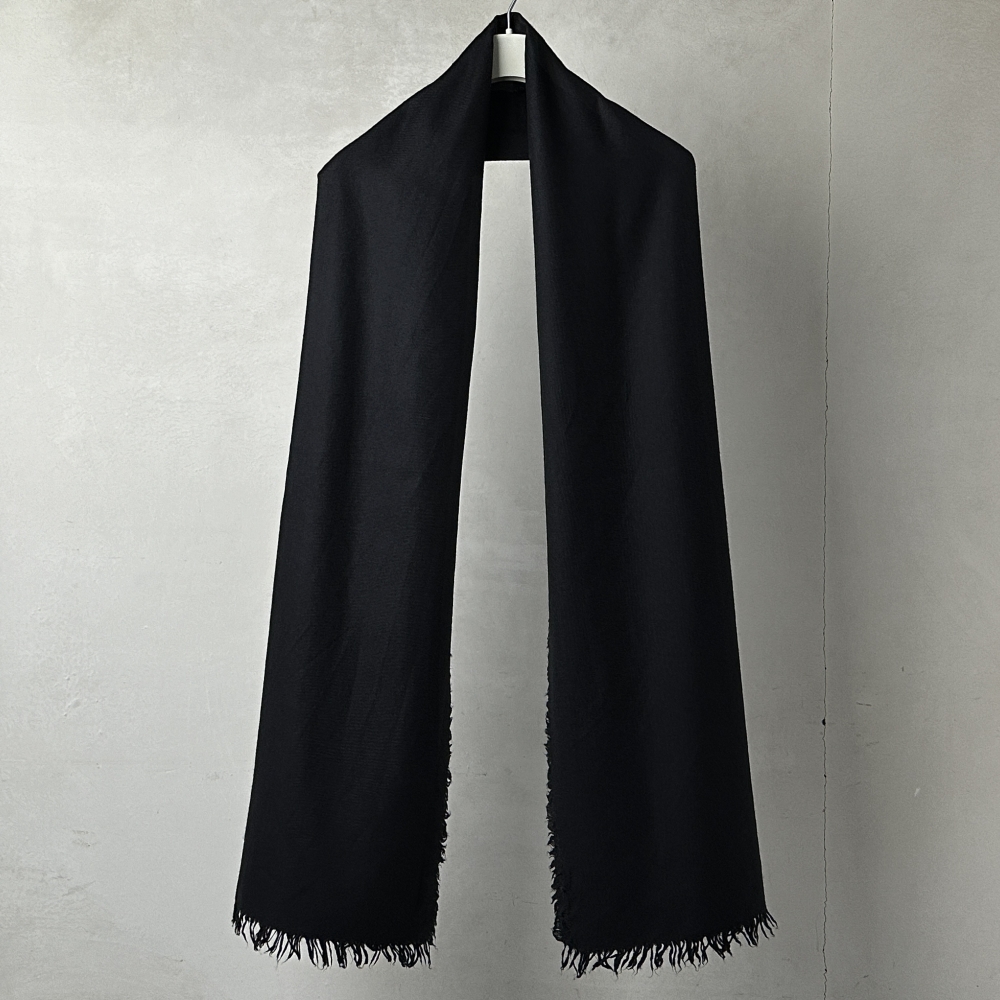 カシミヤシルクの表情も軽やかな大判のストール。ジャケット・パンツとは同生地・同色での展開。ブラックカラーの製品染めを施されて一段と表情を深めたダークネイビーは、ブラックトーンのコーディネートにも穏やかに馴染むグラデーションを表現します。通常はニットに用いられる糸を採用して張りを抑えた柔らかな生地にラフなフリンジを効かせ、コーディネートに静かなアクセントをもたらす粋な仕上がり。肌寒さを感じる時期に適切な暖かさをもたらす素材感に、デザイナーの細やかで真摯なアプローチが滲みます。共地のボタンレスジャケットと合わせてAWシーズンの気分を高めつつ、単体使いでも汎用性を実感したいアイテム。