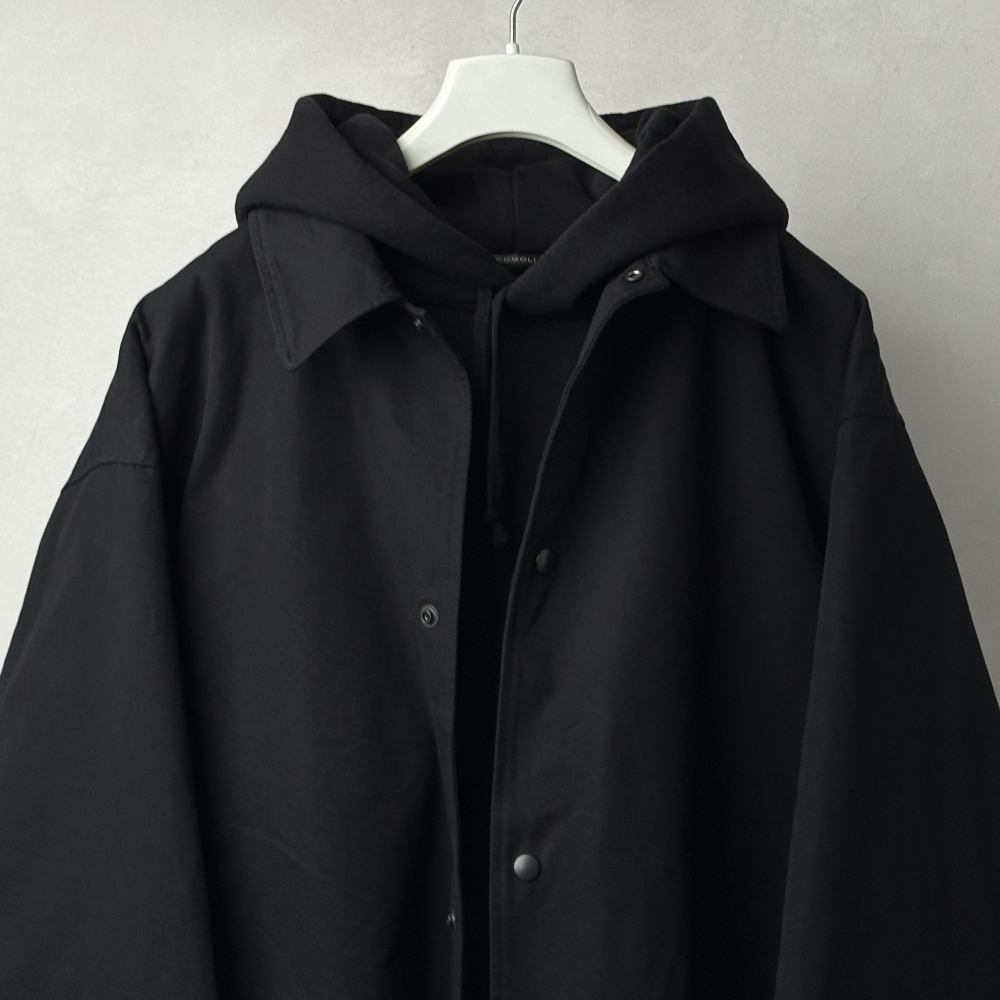 静かにAWシーズンの訪れを告げるワークジャケット。ディテールを抑えた穏やかで普遍的な面構えながら、開けて羽織ればレイヤードの広がりを、閉じてフォルムの妙を、所有者にその豊かな表現力で伝えてくれるアイテム。ドライな肌当たりと張り感が特徴のポリコットンにウールをブレンド、ほんのりと毛羽感のある上質な生地感に。裏地に貼り込まれたコットンネルは肌触り暖かな程良い厚みで、取り回しの良いスナップボタン仕様により外気のコントロールも容易です。不安定な気候に対応できる信頼感、着心地軽やかなパターンも手伝って、寒暖差の大きい季節にも小回りの利いた活躍が期待できます。同生地のポストワークツイル パンツとのセットアップだけでなく、ハーフコートのように様々なアイテムに合わせての単体使いも。移ろう価値観の中で寡黙であり続けるCOMOLIの力強い提案です。