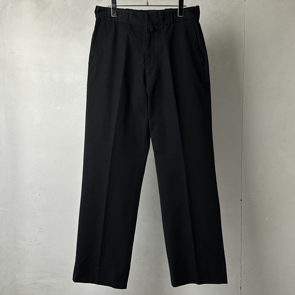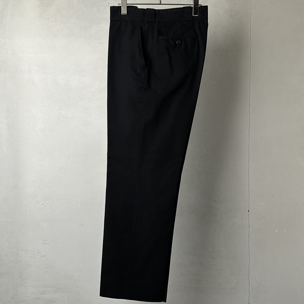 素材を変えつつ展開される都会的なワークパンツ。ゆったりとしたワタリのストレートシルエットとディテールを抑えた匿名性の高さが印象的で、スラックスのような硬さがなく、カジュアルにもなりすぎない絶妙な匙加減。クラシックなピンループにそそられながら、ひとたび脚を通せば穿き心地に心奪われるパターンの妙。独特の張りとドライな肌当たりが特徴のポリコットンにウールをブレンドすることで、毛羽感の見え隠れする豊かな生地感に。同生地のポストワークツイルジャケットとのセットアップはもちろんのこと、クルーネックニットとの上品な合わせに、フックの効いたコットンカシミヤ長袖Tシャツに、単体使いの包容力でスリーシーズン楽しめる汎用性の高いアイテムです。