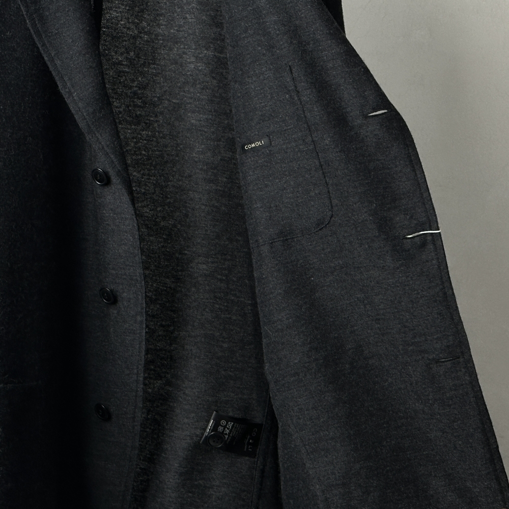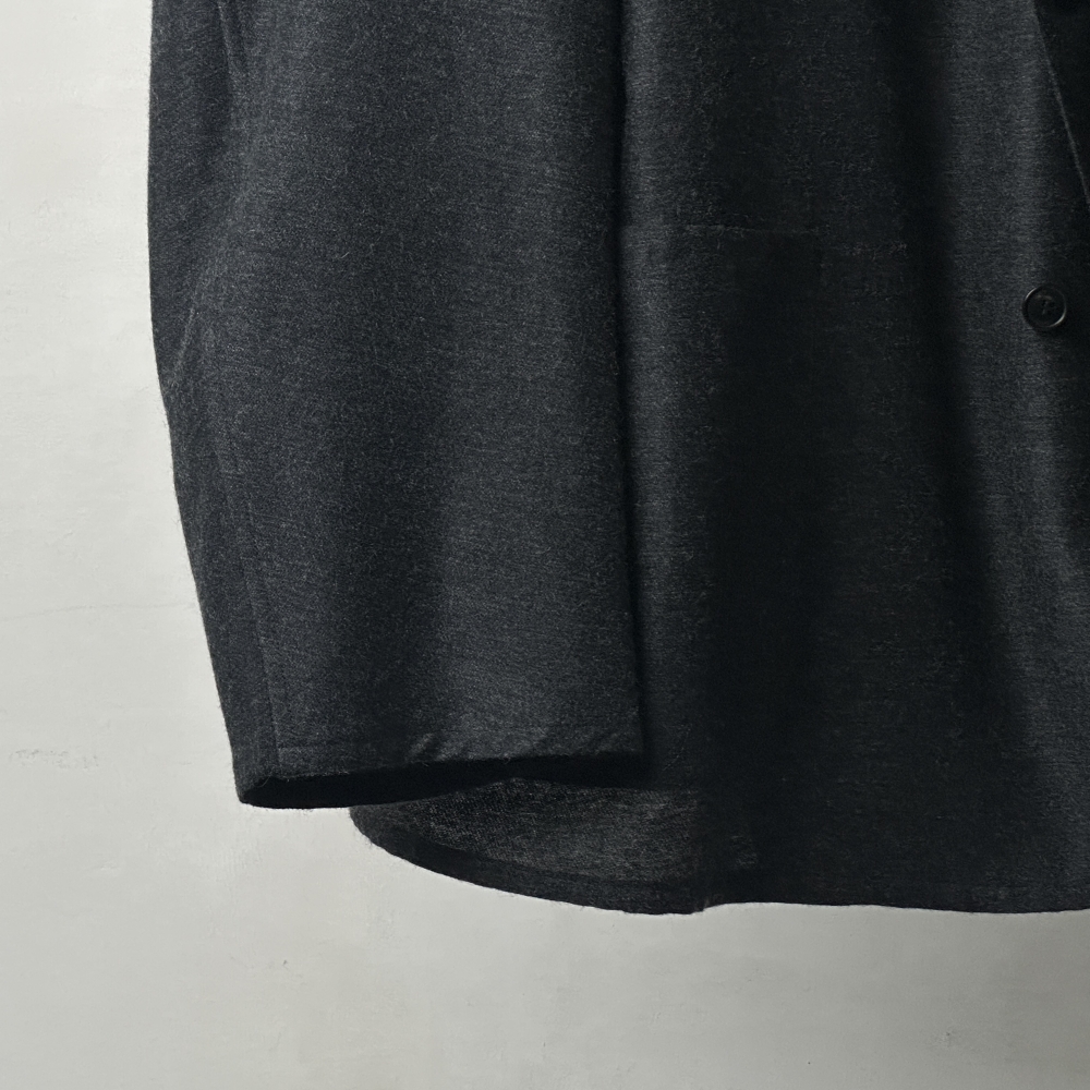 素材を更新しながら展開される軽やかで上質なジャケット。近年はシルク糸のしなやかなテンションを活かしたカシミヤシルクで提案されています。COMOLIが好んで用いるシルク14%の組成が生地に絶妙な張りと強度を持たせ、身体に纏わりつかない快適さをもたらします。今期はシルクの張り感をやや弱め、カシミヤの柔らかさをより強く感じられる仕上がりに。立体的で柔らかなラペル、Tシャツの上から羽織っても様になるドレープの効いた表情は無二の存在感です。同素材で組むセットアップはもちろん、気負わずにタフなパンツに合わせて動きのあるシルエットを楽しみたいところ。ボリュームのあるコーディネートを想定し、size 1・2・3 はそれぞれ従来のジャケットにおける 2・4・6 相当のサイズ感に調整されています。