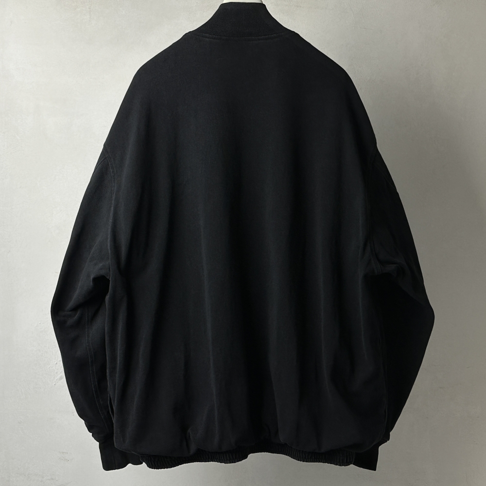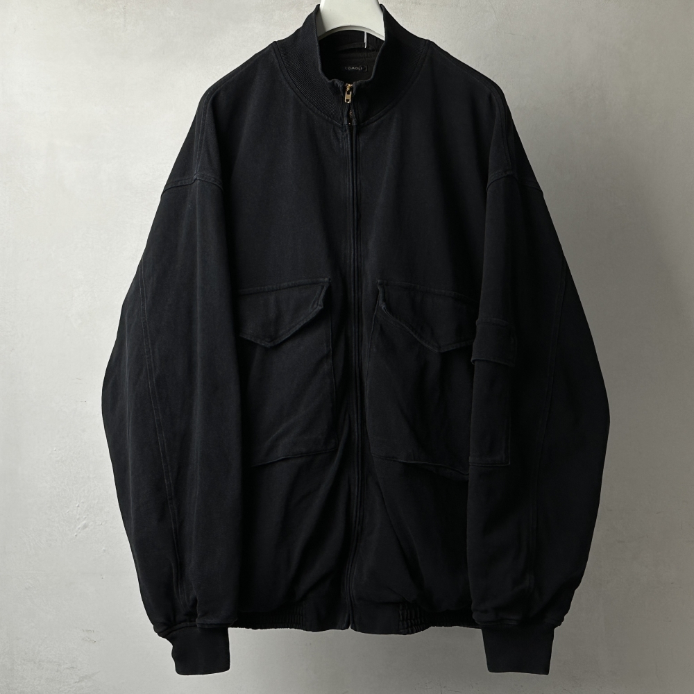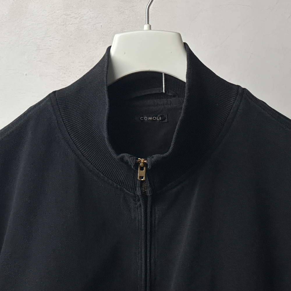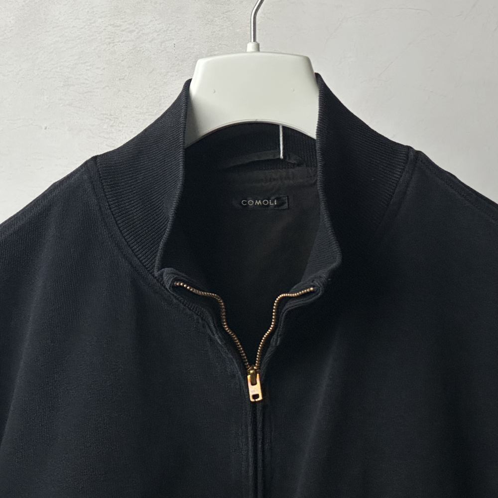 年月を重ねたような硫化染めの表情に心惹かれるG8ジャケット。SSでも展開されたヘビーウェイト天竺素材がAWにおいてもスタイリングの広がりに貢献しています。立ち上がりの良いスタンドネックが落ち感のあるシルエットを引き立て、総裏仕様で張り込まれた布帛が生地に豊かな量感を与えています。着用や洗濯を重ねることで枯れたようにフェードしていく生地感はドライな肌触りも心地良く、季節と歩調を合わせるかのように風合いを深めていきます。今期のルックにおいては同素材のニータックパンツとのセットアップが印象的で、晩夏から秋口の羽織りとしてデニムジップパーカと並ぶフックの効いたアイテムとなっています。