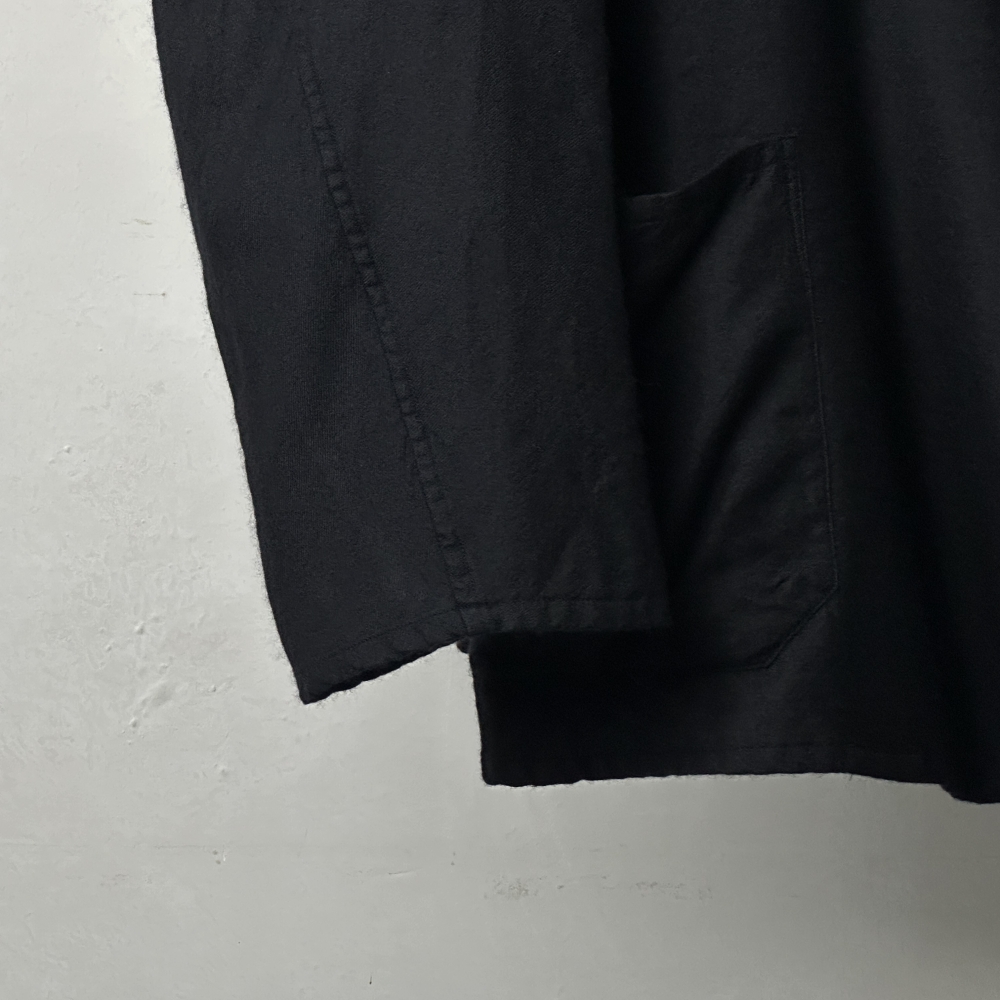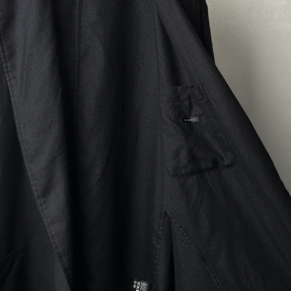 ディテールの抑制がムードを高めるカシミヤシルクのジャケット。フロントボタン・胸ポケットと構成要素を削ぎ落としながらも、色・形状・素材感のいずれもがCOMOLIという個性の基本形を示しているかのようです。ブラックカラーの製品染めを施されて一段と表情を深めたダークネイビーは、ブラックトーンのコーディネートにも穏やかに馴染むグラデーションに。通常はニットに用いられる糸を採用して張りを抑えた柔らかな生地感、どこまでも気配の曖昧なラペルとアンコンの軽やかな仕立てが、一枚の布地をふわりと纏うようなリラックスした着心地をもたらします。素朴なパッチポケットや大見返しの寡黙な内ポケットを備え、羽織りとしての確かな機能性と、デザイナーの生地に対する真摯なアプローチを実感できるアイテム。普段よりゆったりめのサイジングを意識して羽織っていただくと良い雰囲気が出せそうです。今期よりセットアップを意図して同生地のパンツがラインナップに追加されています。