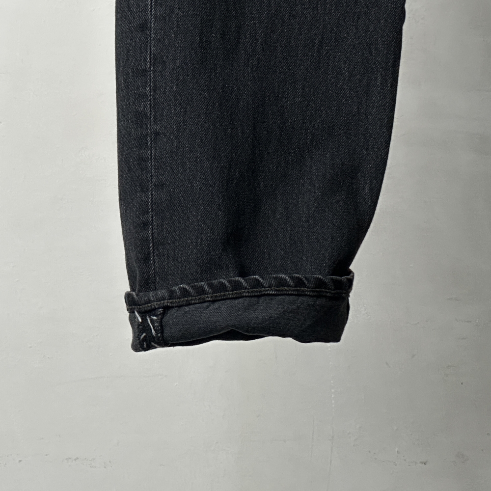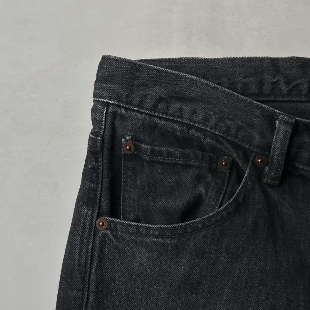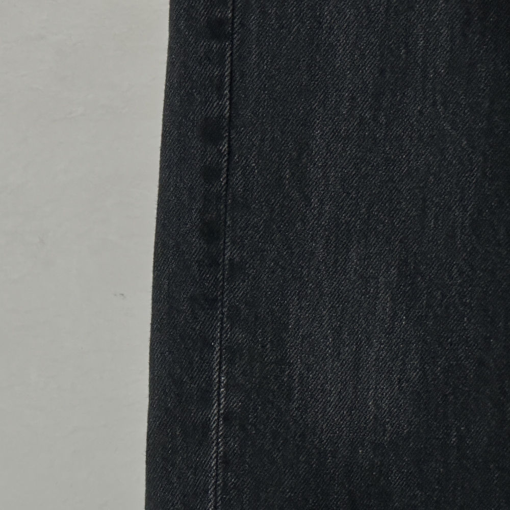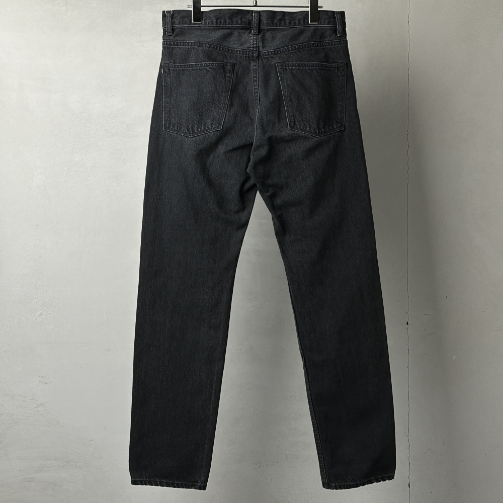 フェードブラックが印象的な細みのデニムパンツ。欧州でスナップされる何気ないコーディネートのような、リアリティの感じられるウォッシュドカラーの匿名性こそがCOMOLIの提案するレギュラーの魅力。膝下から裾にかけてややテーパードさせたフォルムがコーディネートに変化をもたらし、今まで愛用していたトップスがたちまち鮮度を伴って立ち上がってくるようです。穿き込んだ個体のサイドシームに見られるような膝上からのアタリの変化も、まるで初めからそうであったかのように自然に機能しています。何気ないチャコールのウールクルーネックやスコット&チャーターズのナチュラルなクルーネックに溶け込ませ、ロングコートやブラックデニムジップパーカー、足元にはブーツを合わせて秋冬のスタイリングを楽しみたいアイテム。新しく生み出される普通、作為的な無作為を楽しむ特別な体験です。