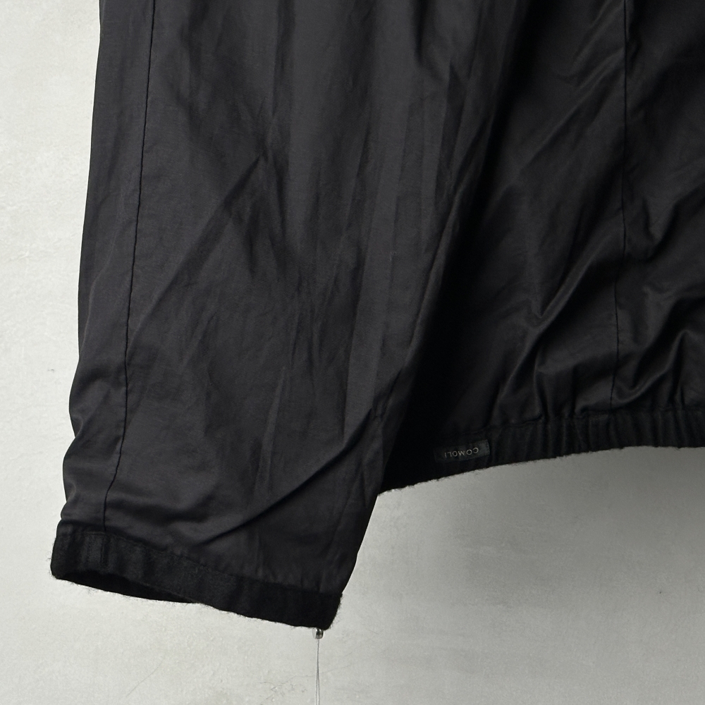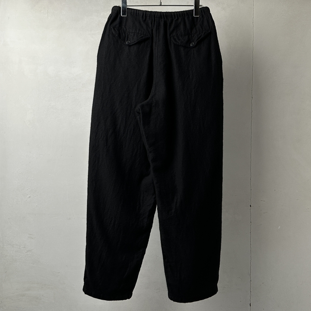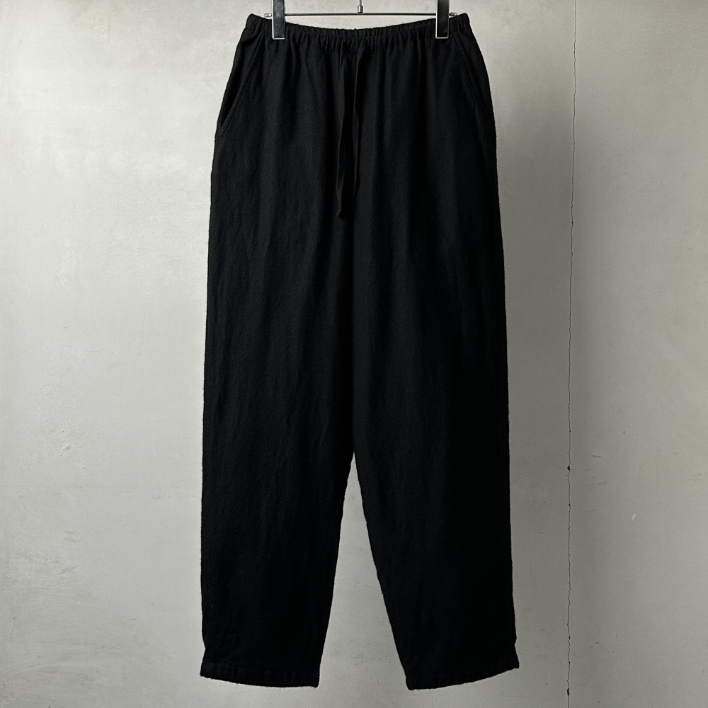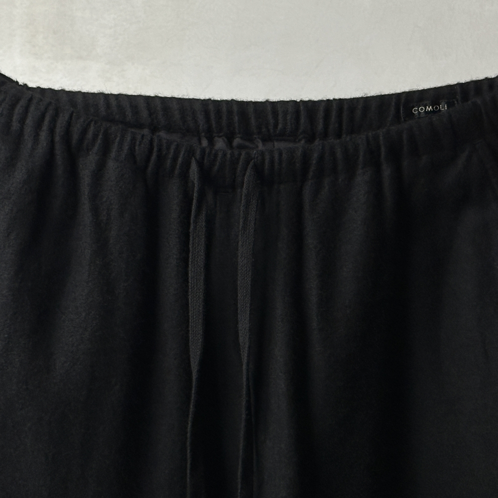 リラックスしたシルエットと豊かな風合いが印象的なテーパードパンツ。総裏仕様でカディコットンを施し、量感のあるフォルムを表現。上質で機能性に富むカシミヤにシルクを配合することで厚みのある生地に張りと光沢感を持たせつつ、ブラックの製品染めを施して自然な毛羽感と落ち着きを与え、粗野でありながら品性をも感じさせるCOMOLIらしいニュアンスに。単体でもスウェットパンツ並の気負わぬ使い勝手で多様なトップスとの合わせを楽しめる汎用性の高さがあり、共地のフロックコートとのセットアップでは無二の存在感を示します。AWシーズン前半のコットンネルから、季節の深まりとともに着こなしを移行していきたいカテゴリーです。