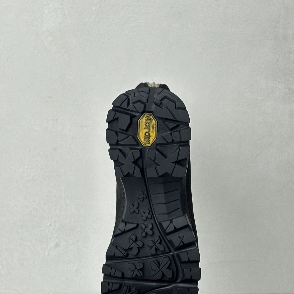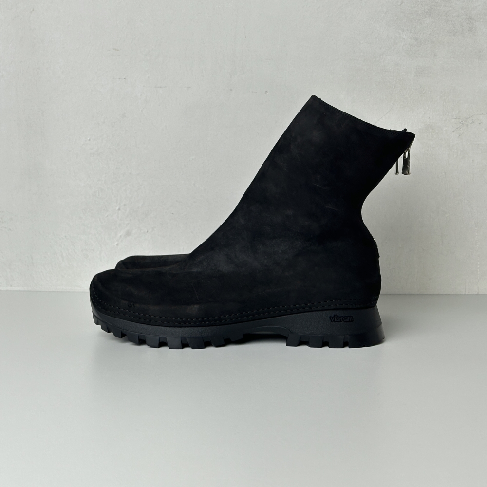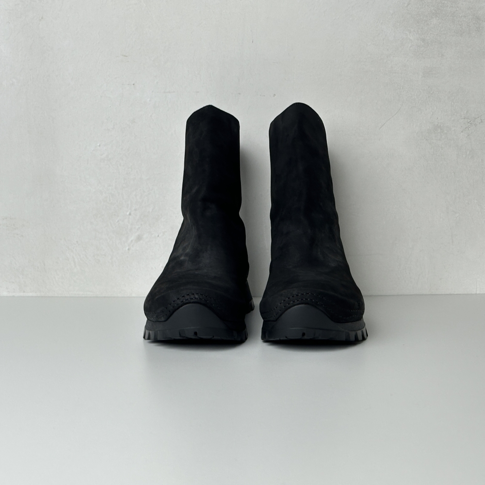 モダンなフォルムを趣のある素材で包み込んだレザーブーツ。黒漆喰のような鈍い湿度を漂わせたブラックヌバック仕様で展開されています。GUIDIのインラインVS01をベースとしたCOMOLIのオーダーは、ホースヌバックとバックジップによる寡黙な個性。アッパーをアウトソールに被せて縫い付ける製法がミニマルでフェティッシュなシルエットを演出しています。ビブラムロゴに付着する染料にその名残を残すタンブラーダイによって独自の色世界が表現され、ラインナップにリズムを与えています。タイトな装着感のシャフトは履き込むほどに身体の一部のように馴染み、特徴的なリンクルで世界観に深みを加えます。GUIDIのアクティブなカテゴリ Bristol Sole はスニーカーとブーツを融合させたような履き心地の良さ。踵のクッションが都市のアスファルトに好適な、軽量で歩きやすいソールとなっています。モールスキンや縮絨など質感豊かなアイテムにも合わせやすく、シーズンを通して多様なスタイルの基点に。COMOLIの感度を形にするGUIDIのアーティスティックなクリエイションを実感できる逸品です。