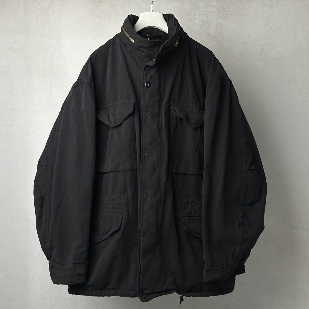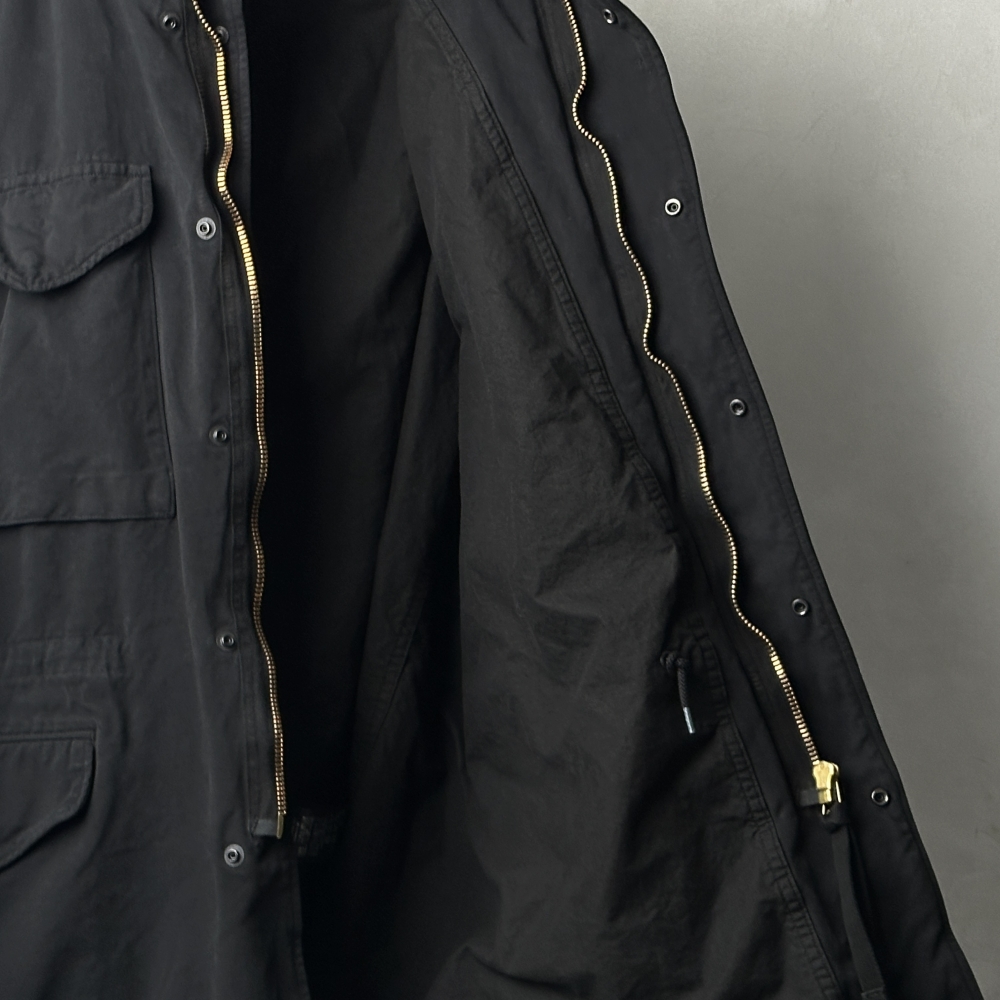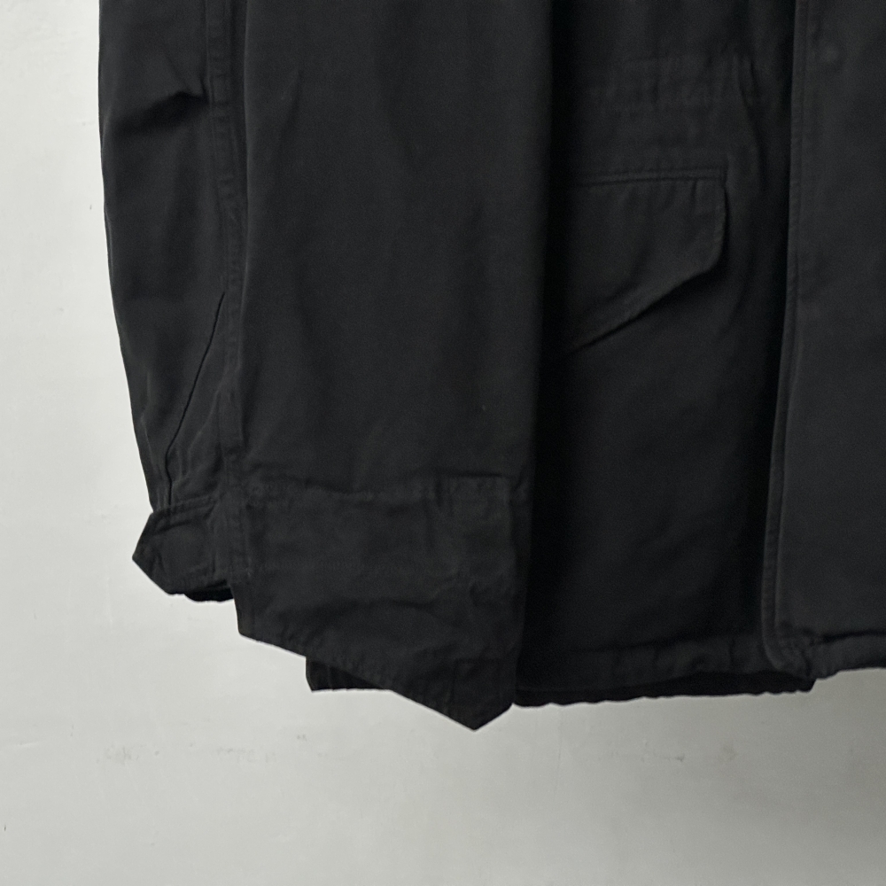 曇り空の似合うフィールドジャケット。製品染めによるブラックカラーの枯れた風合いが乾いた空気と都市の情景に映える、寡黙にして存在感のある仕上がり。簡易フードを格納したブラスジップが印象的な大振りのスタンドカラー、袖の三角フラップ、両肩のプリーツ、そして裾と腰に配されたドローコード。M65のタフなムードを踏襲しながらも、ディテールを突出させることなく静かに調和させています。密度のあるコットンの張りを活かした表地とシャリっとした裏地の関係性が、奥行きのある表情と包容力のあるシルエットを生み出し、インナーを着込んで余裕のあるフィッティングに貢献。コットン裏毛スウェットクルーネックや裏毛パーカをベースに、様々なインナーとの組み合わせ次第で春・秋・冬と活躍してくれそうです。真冬にはカシミヤネックウォーマーで肌当たりも暖かく整えて、袖を通すたび肌に馴染んでいく風合いを楽しみたいアイテムです。