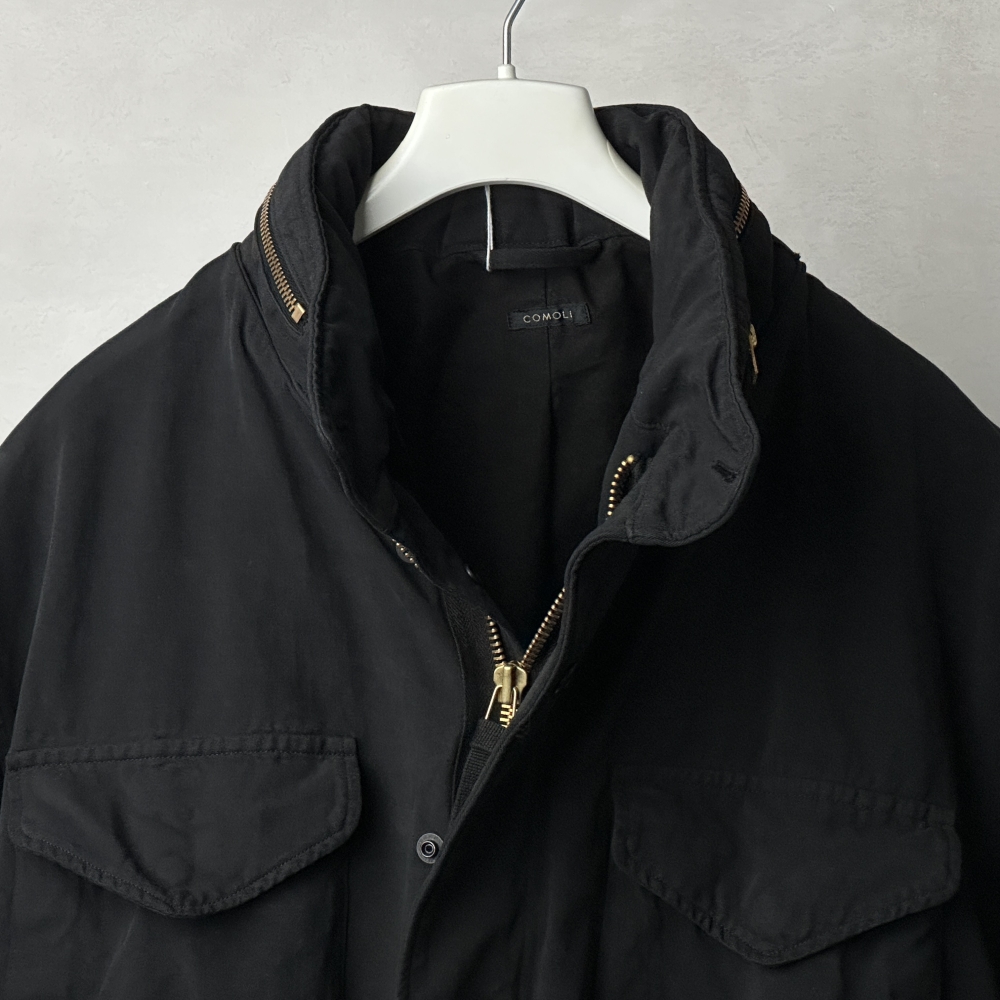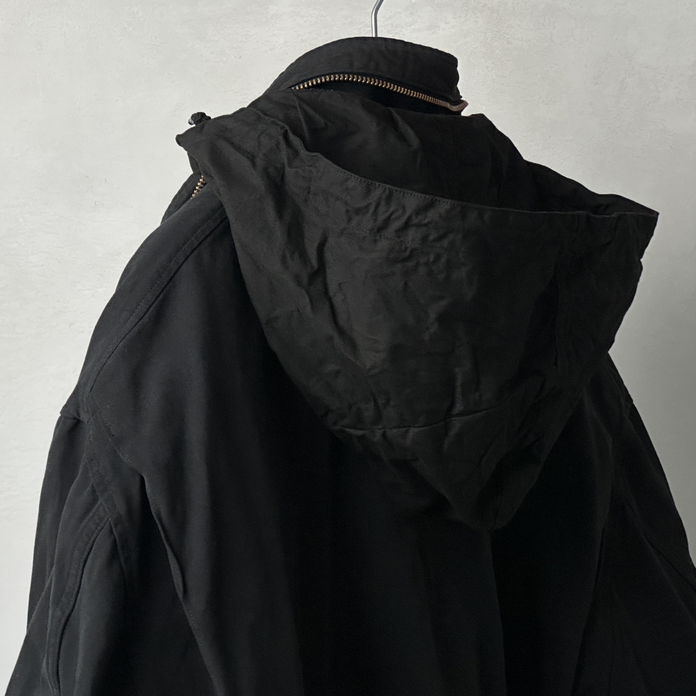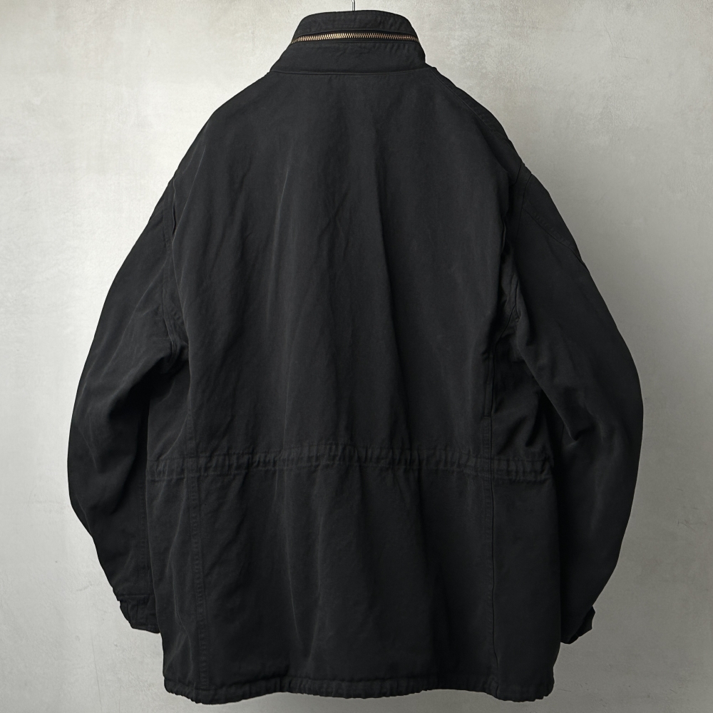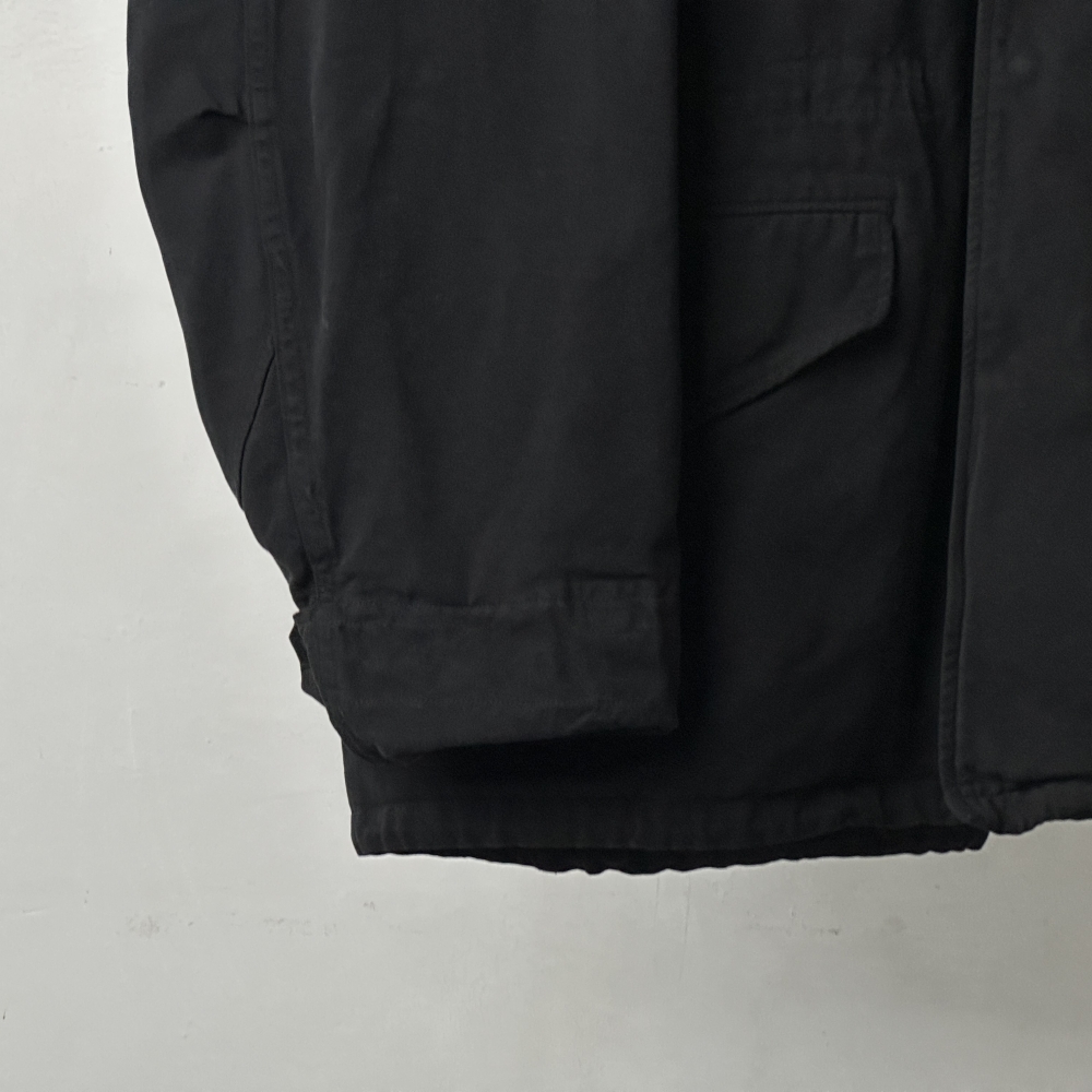 曇り空の似合うフィールドジャケット。製品染めによるブラックカラーの枯れた風合いが乾いた空気と都市の情景に映える、寡黙にして存在感のある仕上がり。簡易フードを格納したブラスジップが印象的な大振りのスタンドカラー、袖の三角フラップ、両肩のプリーツ、そして裾と腰に配されたドローコード。M65のタフなムードを踏襲しながらも、ディテールを突出させることなく静かに調和させています。密度のあるコットンの張りを活かした表地とシャリっとした裏地の関係性が、奥行きのある表情と包容力のあるシルエットを生み出し、インナーを着込んで余裕のあるフィッティングに貢献。コットン裏毛スウェットクルーネックや裏毛パーカをベースに、様々なインナーとの組み合わせ次第で春・秋・冬と活躍してくれそうです。真冬にはカシミヤネックウォーマーで肌当たりも暖かく整えて、袖を通すたび肌に馴染んでいく風合いを楽しみたいアイテムです。