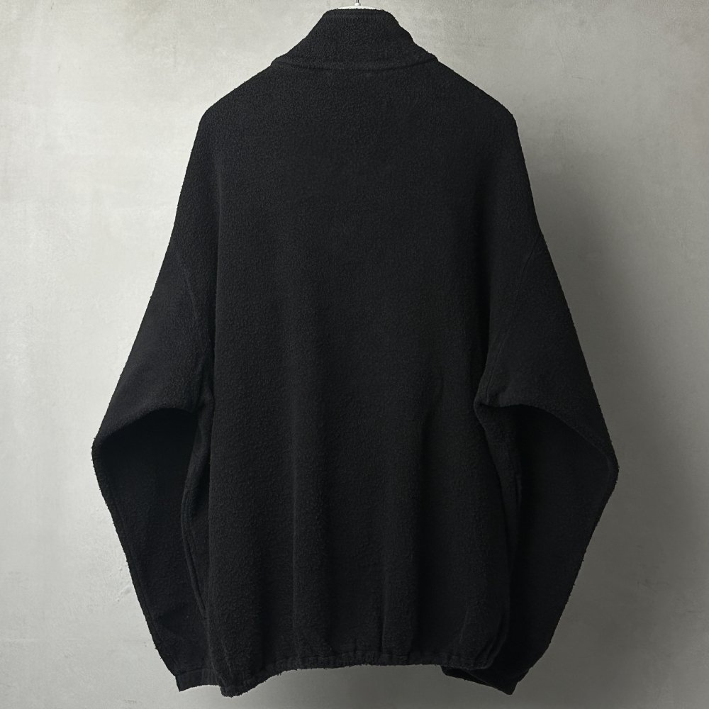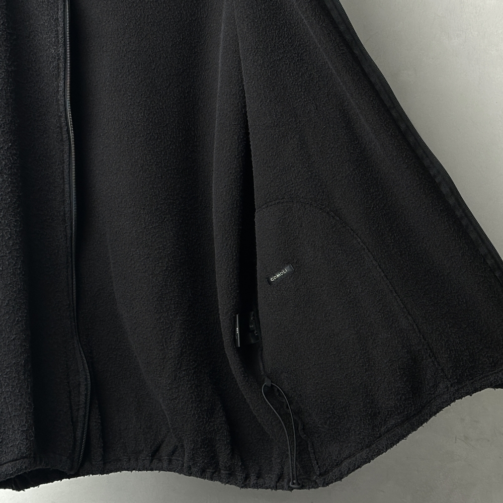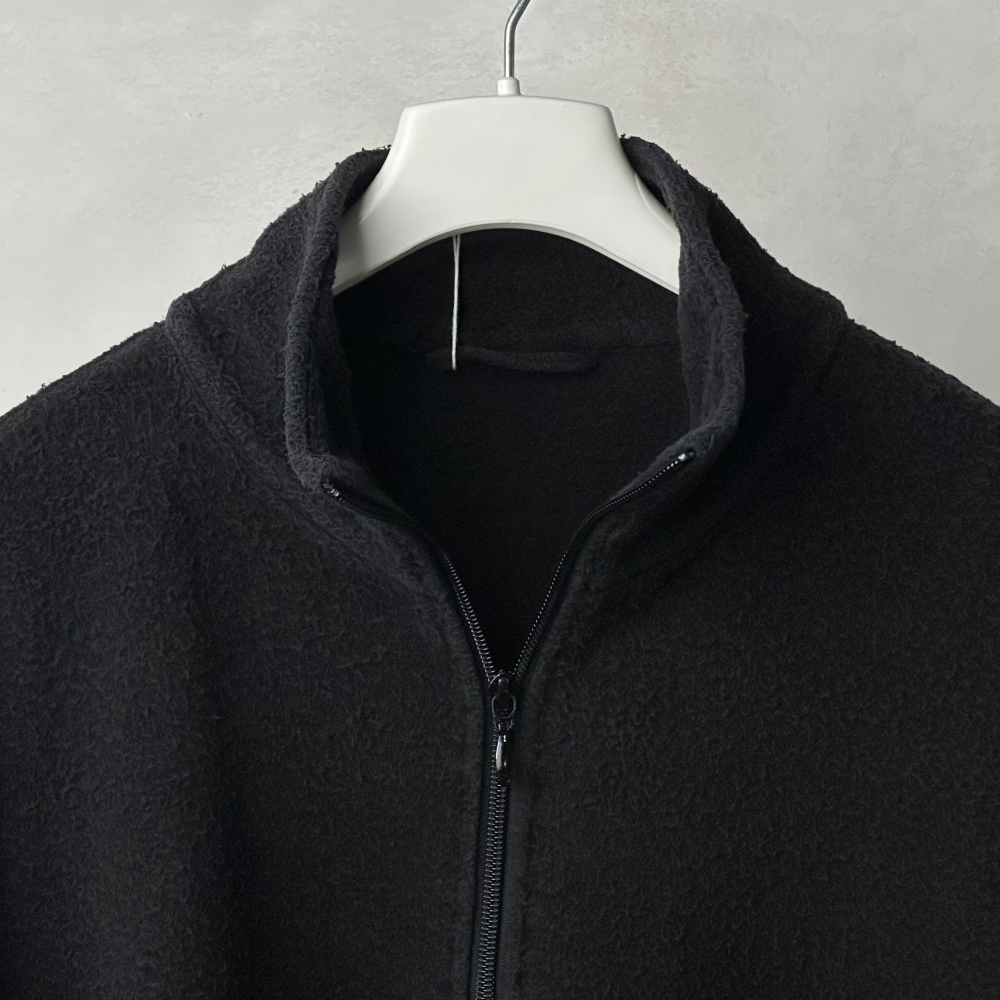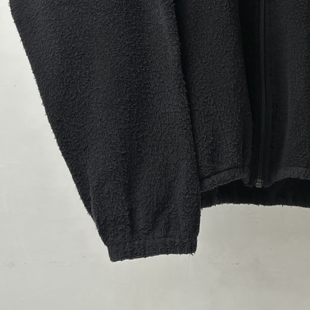 乾き色褪せた表情が印象的なジップジャケット。上質なシルクフリースに製品染と加工を施し、歳月を重ねたような趣の深いフェードブラックを表現。粗野な見た目に反して素材の軽やかさと肌触りの良さが際立つ、COMOLIらしく高い品性を感じさせる仕上がり。SSシーズンのカナパジップジャケットとは同型で、過去に展開されたシルクフリースとは同名ながらも全く新しい性格を有するアイテムとなっています。緩やかなリブの絞りと余裕を持たせた裾幅で落ち感のあるリラックスしたバランスを演出。サイドポケットのステッチにアウトドアウェアのムードを漂わせながら、片裾に備えられたドローコードで緩やかなフォルムの変化を楽しめます。独特の枯れた風合いはインナーやトップスとして様々なテイストに取り入れやすく、黒基調のコーディネートのアクセントとして全体に奥行きを与えてくれます。