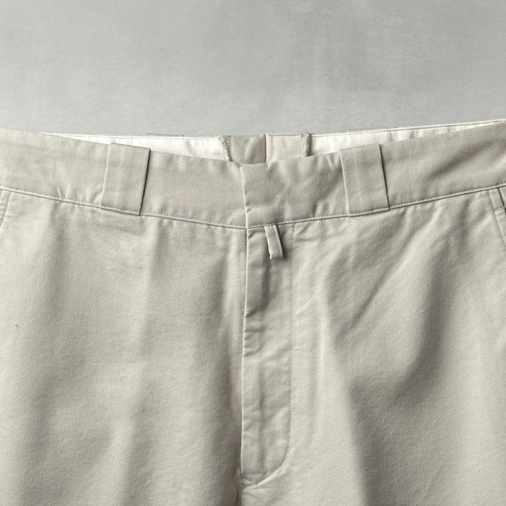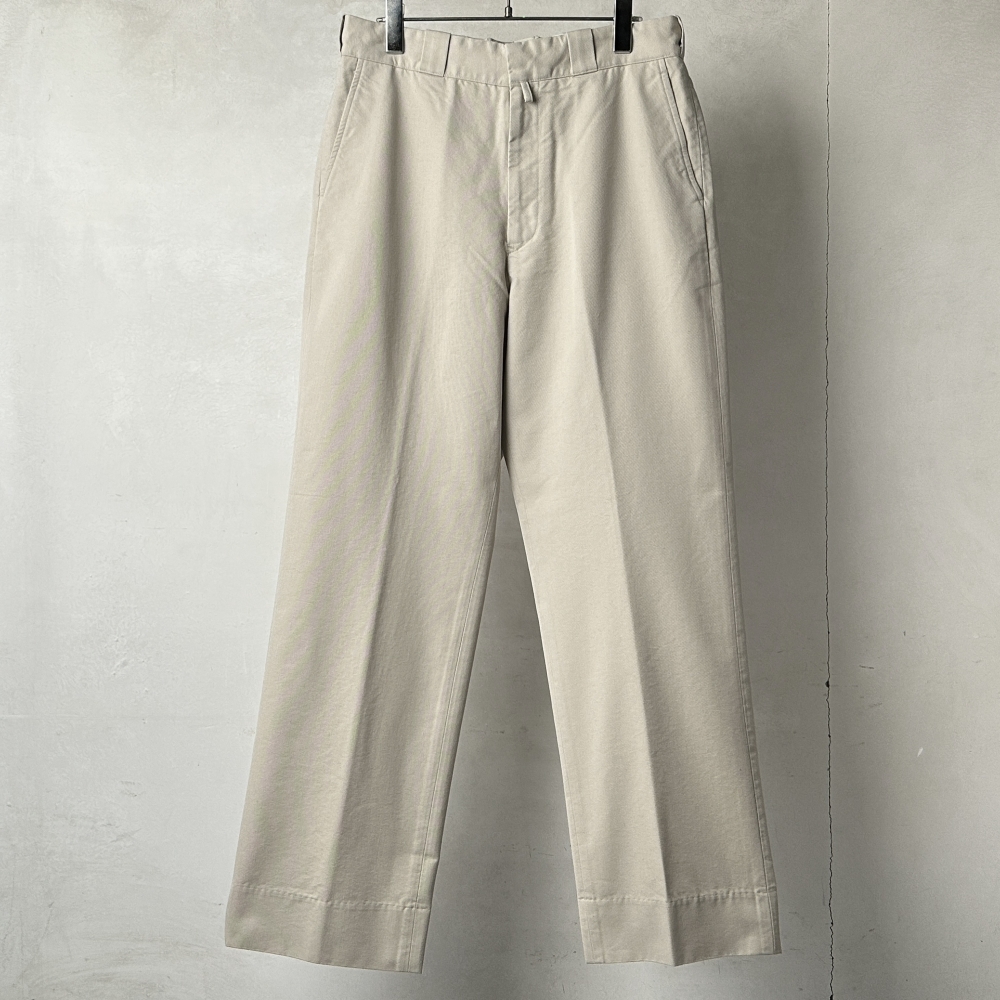 素材を変えながら継続展開される都会的なワークパンツ。ノスタルジックなアイボリーがツイル生地に鮮度を与えています。スラックスほどのカタさはなく、カジュアルにも振りすぎない絶妙な匙加減。ワタリに余裕を持たせたストレートシルエットは匿名性が高く、ラインナップにおいてはその普遍的な形状がむしろ印象的に映ります。コットン・ポリエステル・ウールが程よくブレンドされた表地はわずかに毛羽立ち、しなやかな張りが感じられる豊かな風合い。着用を重ねて洗い込んでいくことで、カサついた質感とアタリが出て味わいを増していきます。ブラックのコットンニットや5Gカーディガンのややルーズな雰囲気に合わせてスリーシーズン楽しめる汎用性の高さも魅力的。クラシックなピンループにそそられて脚を通せば、しなやかな穿き心地とパターンの妙に心が躍ります。