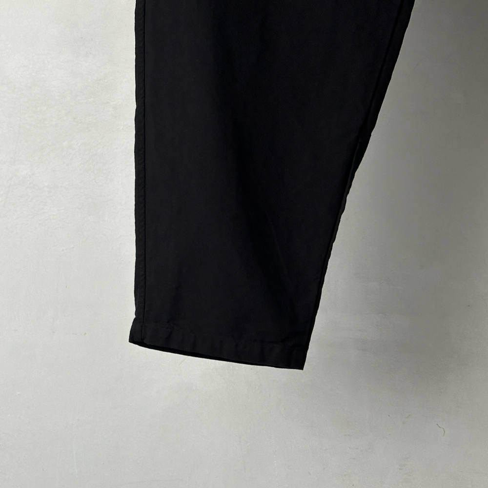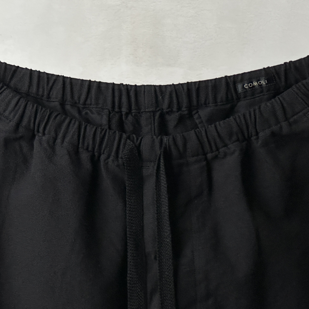 ラフな顔つきと柔らかなニュアンスが共存するドローストリングパンツ。今期はブラックの生地にもう一度製品染めを施し、僅かに赤味の効いた奥行きと濃度のある色調で展開されています。幅のあるワタリから裾にかけて緩やかにテーパードしたフォルムを特徴とする、取り回しの良い腰紐裾ゴム仕様。単体での合わせやすさはもちろん、コットンダックのドライな風合いとソフトなドレープ感が同生地のジャケットとのセットアップにおいて意外なほどの上品さを演出します。一枚仕立ての軽やかな着心地はSSシーズンに好適で、ご家庭での洗濯も容易なデイリーユースに適したアイテムです。従来の同型パンツよりそれぞれやや大きめに調整され、より明確にCOMOLIらしいスタイリングが提案されています。