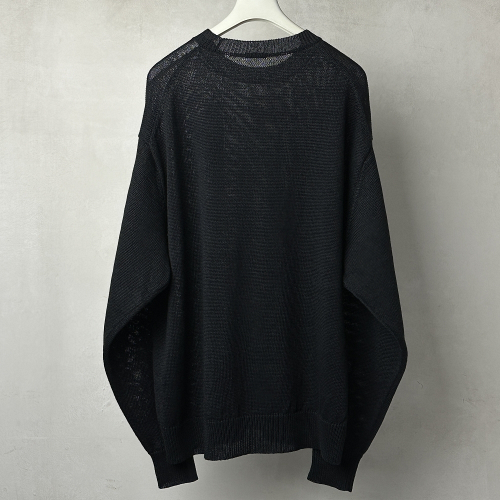 6月に着たいドライなクルーネックニット。リネン特有の艶と張りがあり、湿度が増す季節に好適な乾いた素材感。ラフなムードとさらりとした肌触りの快適さでSSシーズンの気分を高めてくれる仕上がりです。風通しの良いざっくりとした編み地は、着ていくうちに伸びが出て程良い抜け感を演出。カットソーのように単体で雰囲気を出せる気軽さ、袖をまくった姿も様になる使い勝手の良さも魅力的です。シンプルに太さのあるパンツに合わせてヘンプダックショルダーを肩掛けに。SSシーズンを彩るシルクコットンのような個性に相応しいインナーとしても。一枚あると着こなしに幅を出せる懐の広いアイテムです。