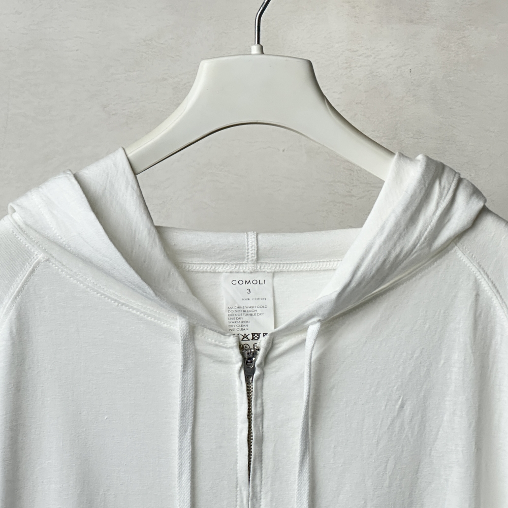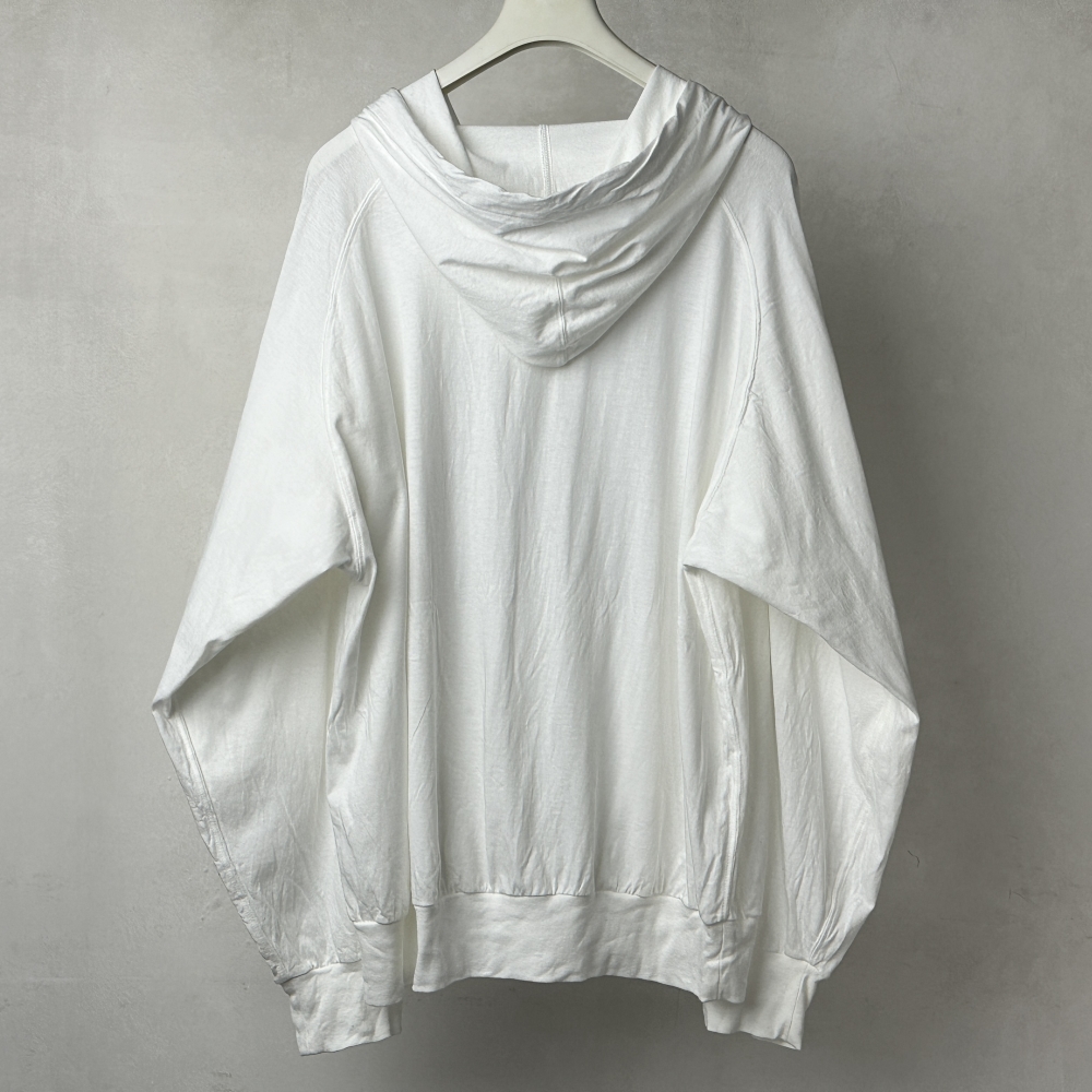 サープラスTシャツと同素材の軽やかなジップパーカ。空気をはらむような生地はドライで肌離れが良く、気温の高い時期にも取り入れやすい素材感。コットンジャージに輪を掛けてライトな着心地も印象的で、適度な落ち感がありながらもアウトラインに僅かな膨らみを感じる絶妙な仕上がりです。起伏も穏やかで気配の少ないフードが大人のパーカとしてのさりげなさを演出。ボディカラーに映えるシルバージッパーが最適な表情を引き出し、ブラックカラーに羽織れるホワイトとして、コーディネートにしっくりと馴染ませてくれそうです。同生地の半袖や長袖Tシャツと重ねて表情を付けたり、肩にかけても、腰に巻いても。気兼ねせず様々なシーンで着用できるデイリーアイテムです。