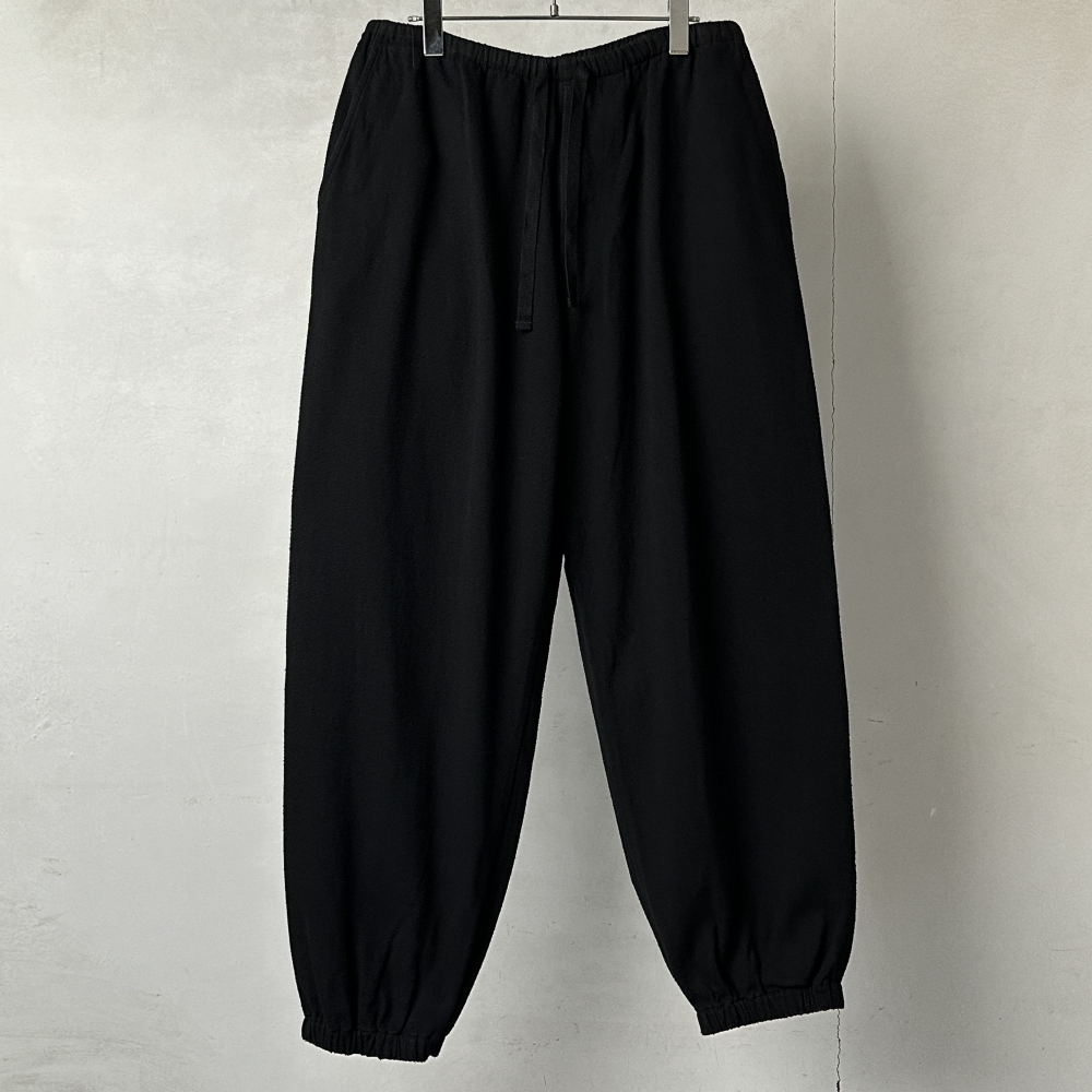 シルクネップの静かな個性が印象的なドローストリングパンツ。通常の黒いシルクネップ生地にブラウンの製品染めを施し、微かにサンフェードの気配を感じさせるような趣のあるブラックカラーに仕上げています。膝巾を持たせ腰から裾へと流れる豊かなアウトラインは、やがて裾ゴムのクッションによって緩急のあるシルエットを演出します。軽く柔らかなシルクは吸湿性や放湿性に優れ、湿度・気温の上昇が課題となるシーズンに適した素材。着用と洗いを繰り返すことで徐々にネップが取れ落ち、スムースな顔つきに変化していく特性を持つこの生地は、他をもって代え難い魅力に満ちています。様々なアイテムに合わせやすく、SSラインナップの土台を支えるパンツの筆頭にして、COMOLIを深く理解する上で欠かせない存在です。