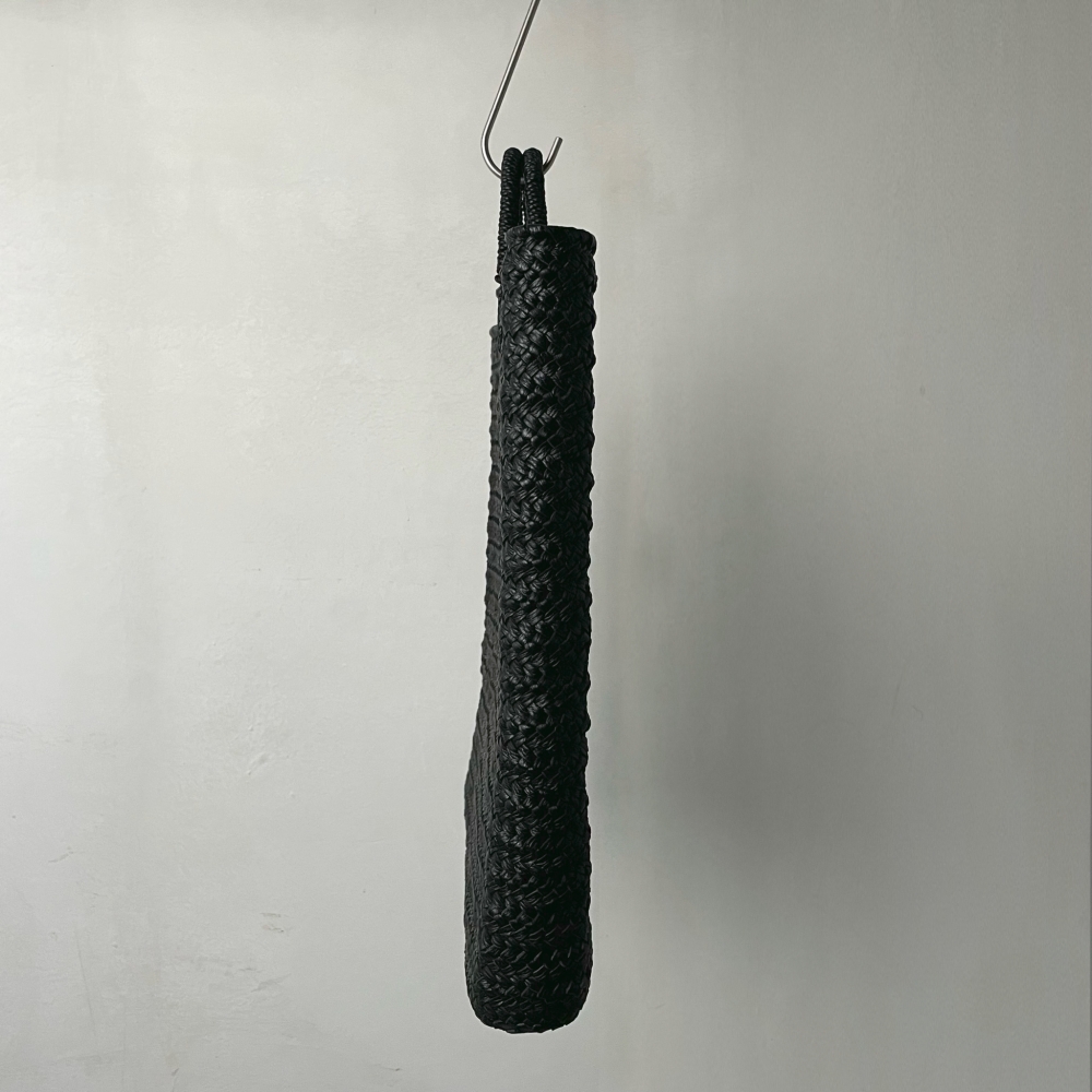 バングラデシュの職人が木型でひとつひとつ編み上げたレザーバッグ。大量生産の工業製品とは異なる手工芸品ならではの表情が趣を感じさせてくれます。伸びや型崩れを防ぐ芯糸が施されたレザーコードを貼り合せて編み込んでいるため内側も表革となっています。Aetaの刺繍が入った保管用の袋付き。
