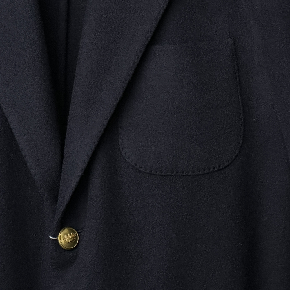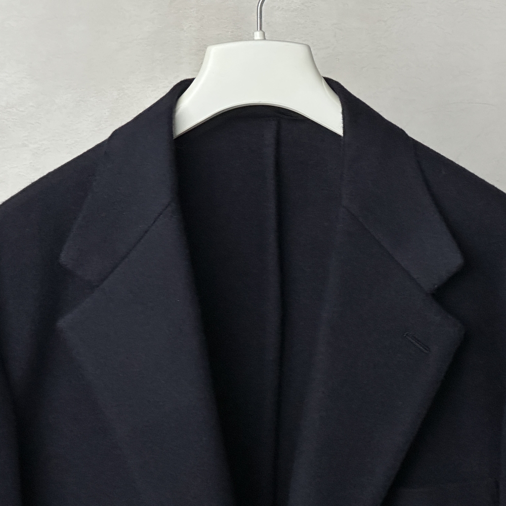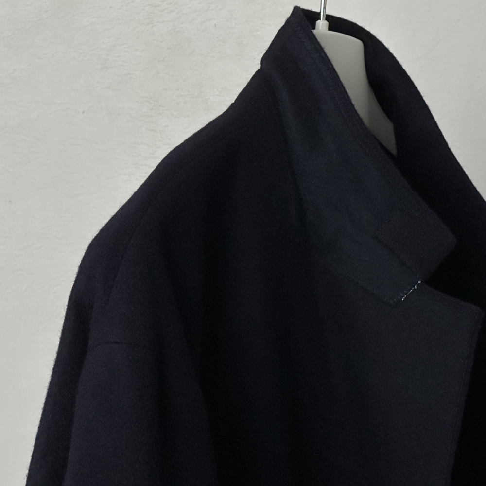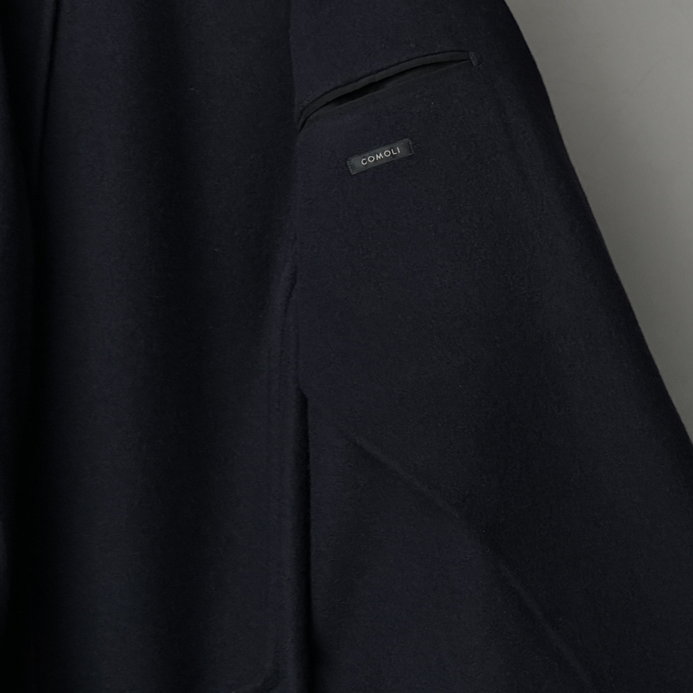 AWシーズンに展開されるカシミヤシリーズから、上質なブレザーが提案されています。あえて毛芯を使わず仕上げ、薄手ながらも柔らかな膨らみのある生地感で、ゆったりとした動きのある着こなしが楽しめます。クラシックなスタイリングだけでなく、ジャージのセットアップにスニーカーのような気負わない装いにも、やや大きめのサイズ感でさらっと合わせたいネイビーブレザーです。エンブレムボタンの鈍い輝きをクラシックなアクセントに、COMOLIのもう一つの顔であるコンサバティブな表情をストリートで味わってみては。