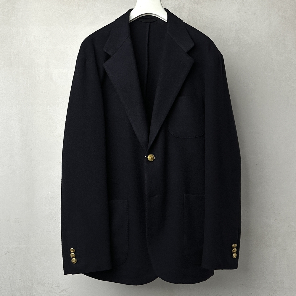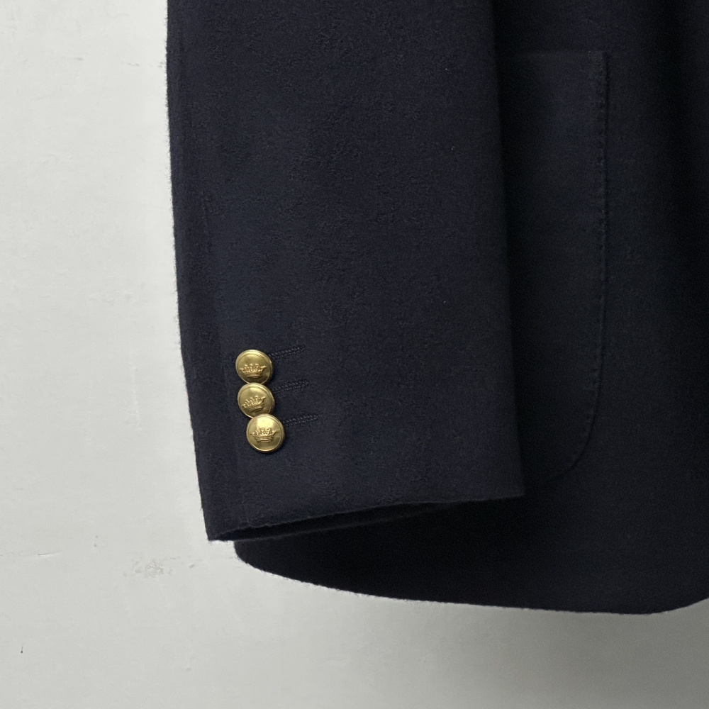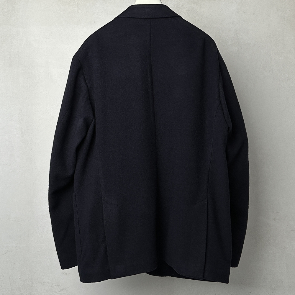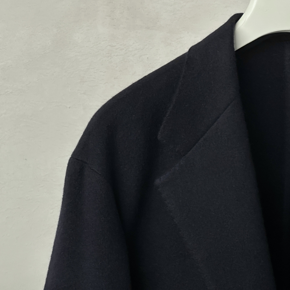 AWシーズンに展開されるカシミヤシリーズから、上質なブレザーが提案されています。あえて毛芯を使わず仕上げ、薄手ながらも柔らかな膨らみのある生地感で、ゆったりとした動きのある着こなしが楽しめます。クラシックなスタイリングだけでなく、ジャージのセットアップにスニーカーのような気負わない装いにも、やや大きめのサイズ感でさらっと合わせたいネイビーブレザーです。エンブレムボタンの鈍い輝きをクラシックなアクセントに、COMOLIのもう一つの顔であるコンサバティブな表情をストリートで味わってみては。