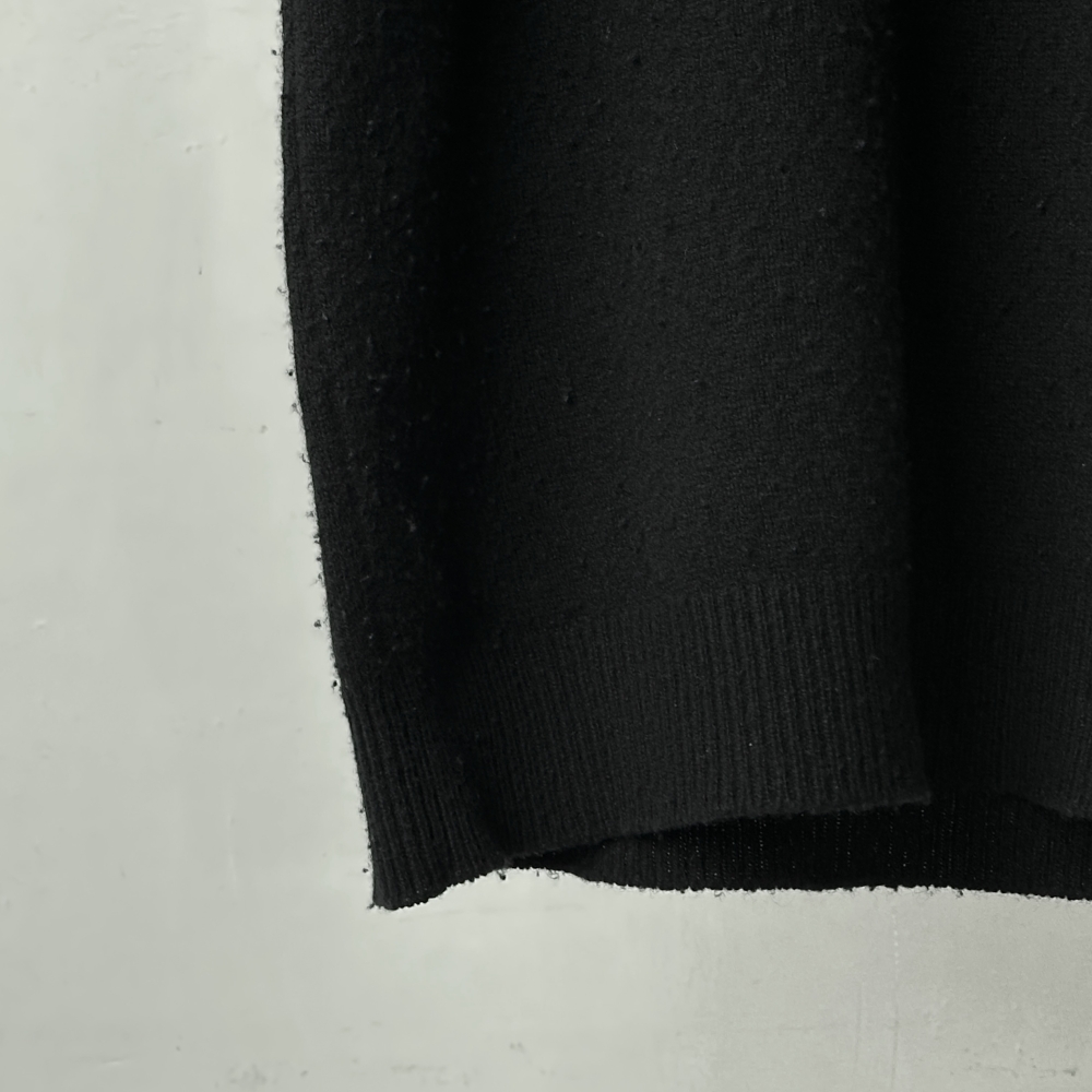 柔らかく軽やかなクルーネックニット。AWシーズンのラインナップに合わせて落ち着きのあるブラックカラーが展開されています。吸い付きの良いネックの表情がフロントの印象を引き締め、トップスとしてもインナーとしてもジャストフィッティングなサイズ感。ミドルゲージのラムズウールが持つ程良くラフな質感は、ピリングすらその身に馴染ませながら着用を重ねるごとに風合いを高め、いわゆる普段着としてのポテンシャルの高さを感じさせます。パンツの太さを選ばない取り回しの良さ、スタイリングの中核を担うに相応しい普遍性が、COMOLIのコンサバティブな一面を存分に引き出してくれそうです。