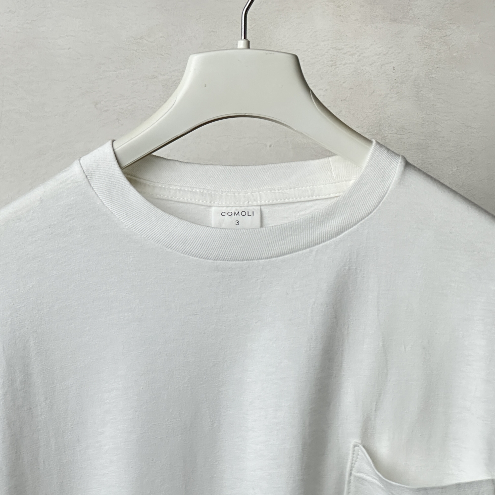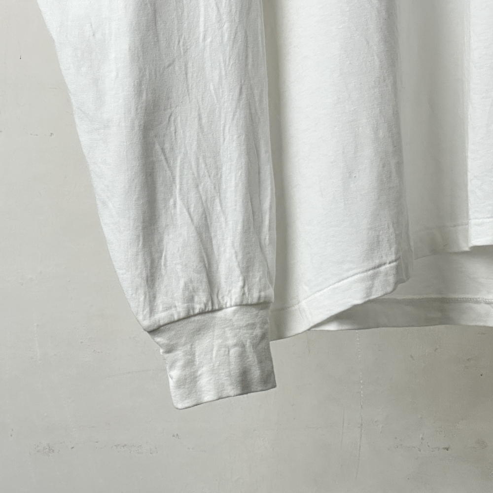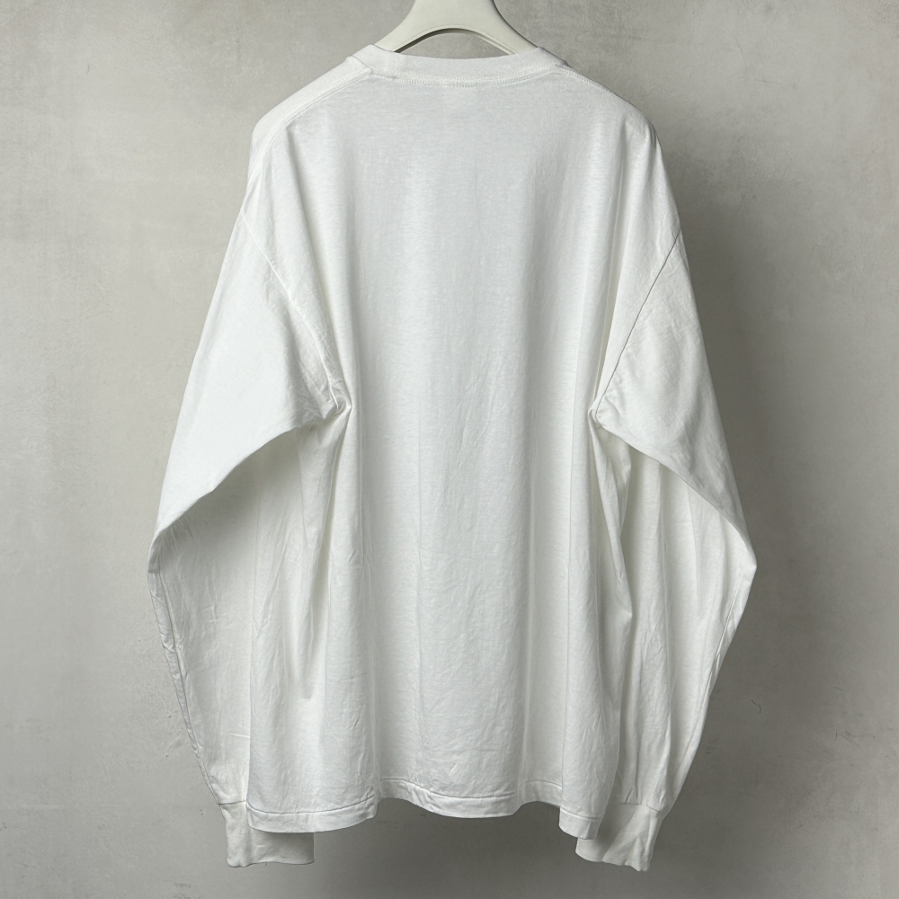 官給品のムード漂うスタンダードなロングスリーブTシャツ。ダークカラーのラインナップに映えるホワイトが展開されています。ムラ感のある糸を用いた空気をはらむような生地はカリッとドライで肌離れ良く、気温の高い時期にも取り入れやすい素材感。コットンジャージに輪を掛けてライトな着心地が印象的で、適度な落ち感がありながらもアウトラインに僅かな膨らみを感じる絶妙な仕上がりです。胸ポケットの控え目な情報量も心地良く、一枚でも着られるバランスながら、コットンジャージに比してややコンパクト、インナー寄りの丈感でリネンニットの中にも着込める絶妙さ。気兼ねせず様々なシーンで着用できるデイリーアイテムながら、肌に直接触れるものだけに素材にこだわりたい、そんな思いに応えてくれそうです。今期は同生地のパーカに重ねて表情に奥行きを持たせる楽しみも。着用と洗いを繰り返すことで毛羽が出て生地の風合いが増していきます。