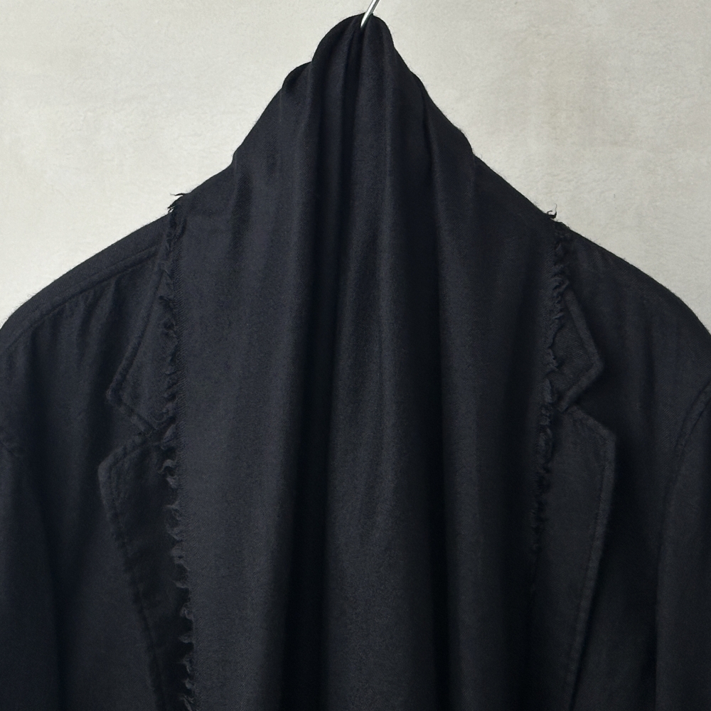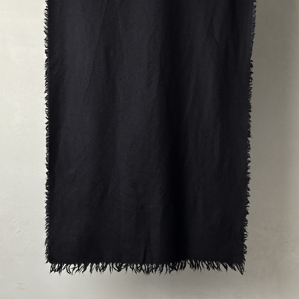 カシミヤシルクの表情も軽やかな大判のストール。ジャケット・パンツとは同生地・同色での展開。ブラックカラーの製品染めを施されて一段と表情を深めたダークネイビーは、ブラックトーンのコーディネートにも穏やかに馴染むグラデーションを表現します。通常はニットに用いられる糸を採用して張りを抑えた柔らかな生地にラフなフリンジを効かせ、コーディネートに静かなアクセントをもたらす粋な仕上がり。肌寒さを感じる時期に適切な暖かさをもたらす素材感に、デザイナーの細やかで真摯なアプローチが滲みます。共地のボタンレスジャケットと合わせてAWシーズンの気分を高めつつ、単体使いでも汎用性を実感したいアイテム。