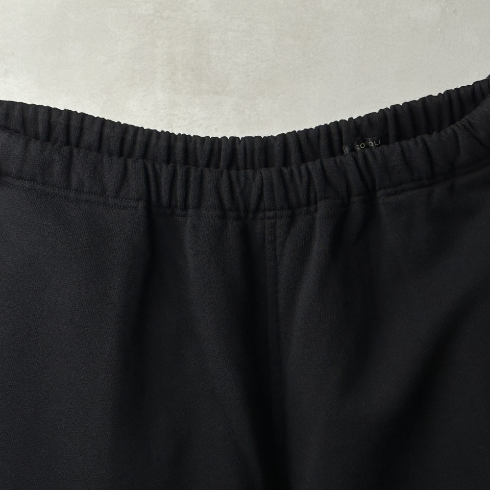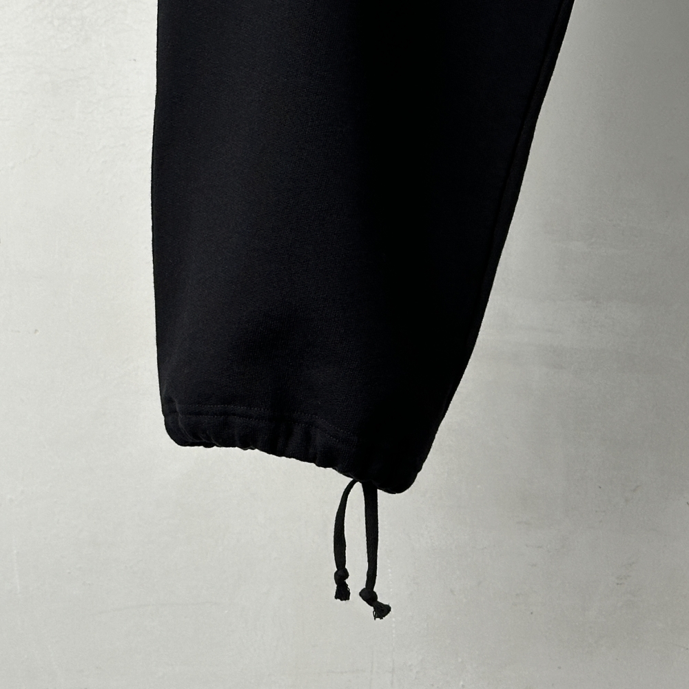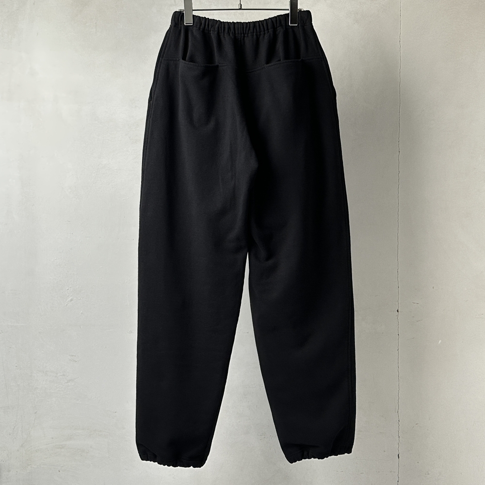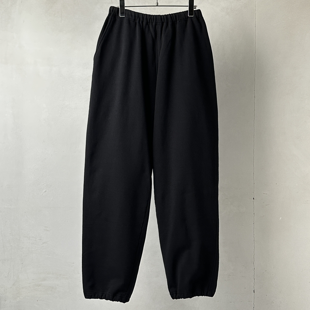 肉厚ながらも軽やかさのあるコットン裏毛のスウェットパンツ。COMOLIらしい着こなしの核となるアイテム。ドライな質感の表地に柔らかな肌触りの裏毛が心地良く、ヘビーローテーションに耐えるタフさが魅力です。スウェットながら落ち着きのあるトーンに品性を宿しながら、量感のあるフォルムにはどこか粗野な風合いも。裾をストレートに落としてクッションを出しても、裾紐を絞って溜まりを作ってもラフになりすぎず、ムードのあるシルエットが作れます。単体使いはもちろんのこと、コットン裏毛クルーネックとのセットアップを組み、量感のあるアウターを合わせることで奥行きのあるコーディネートを演出します。飾り気のないワンウォッシュのブラックはトップスやアウターとの悩ましい駆け引きに相応しく、飽きのこない合わせを楽しめそうです。