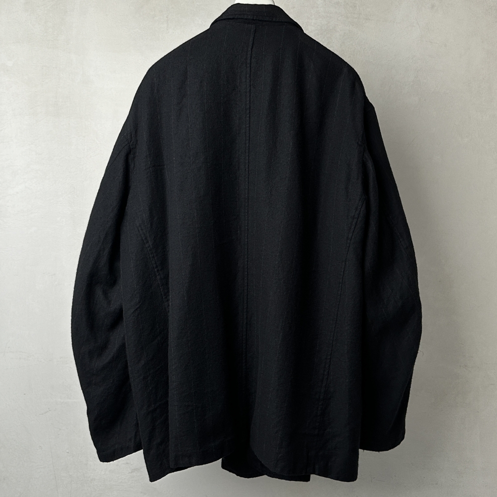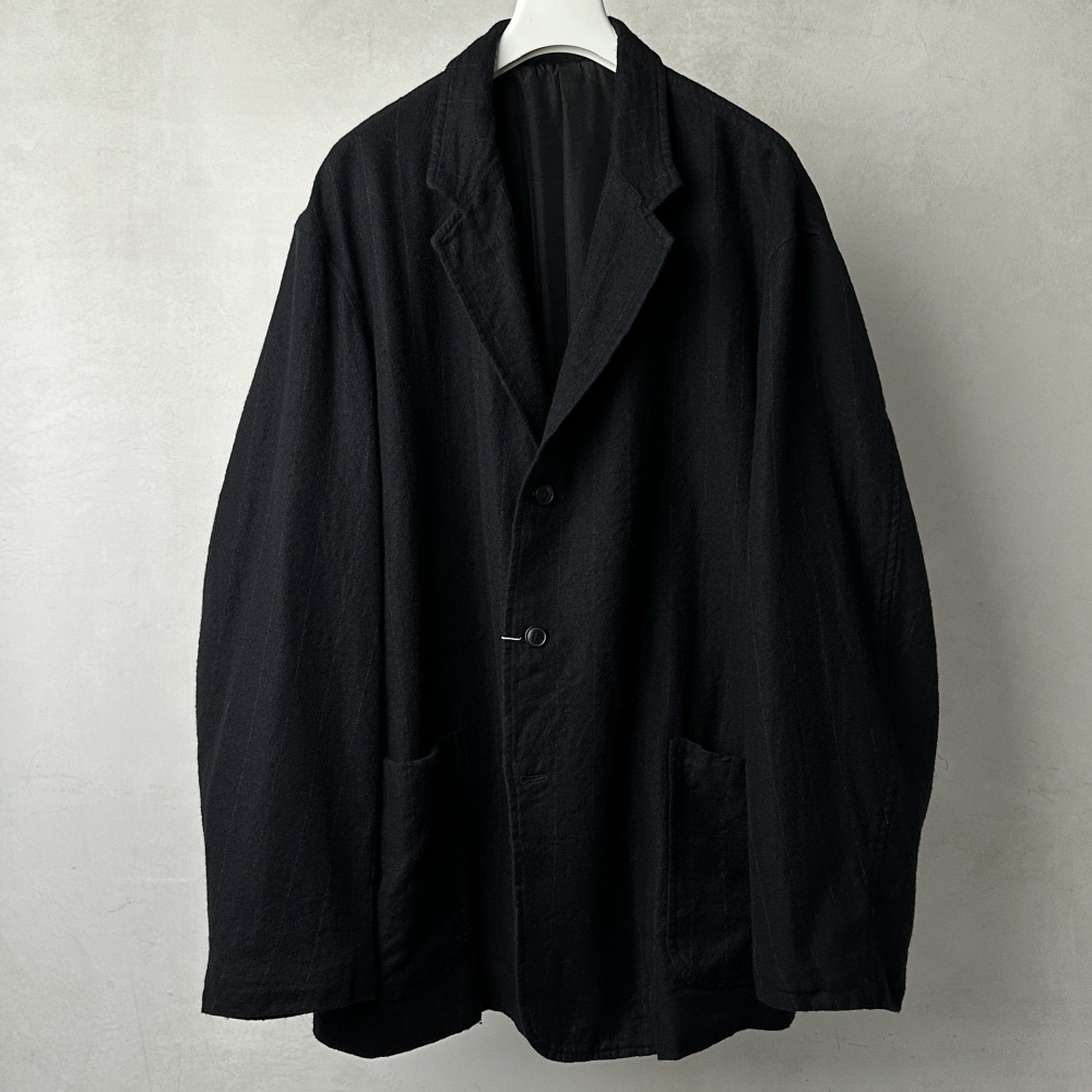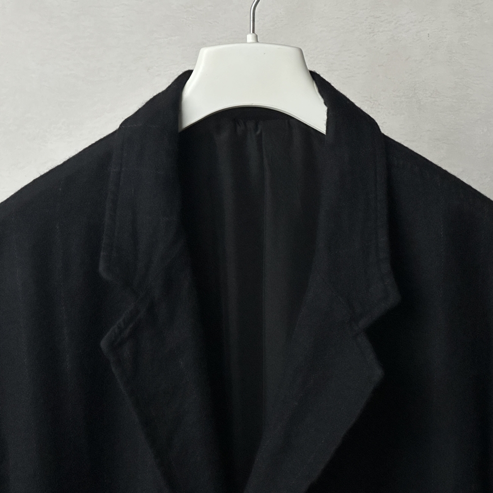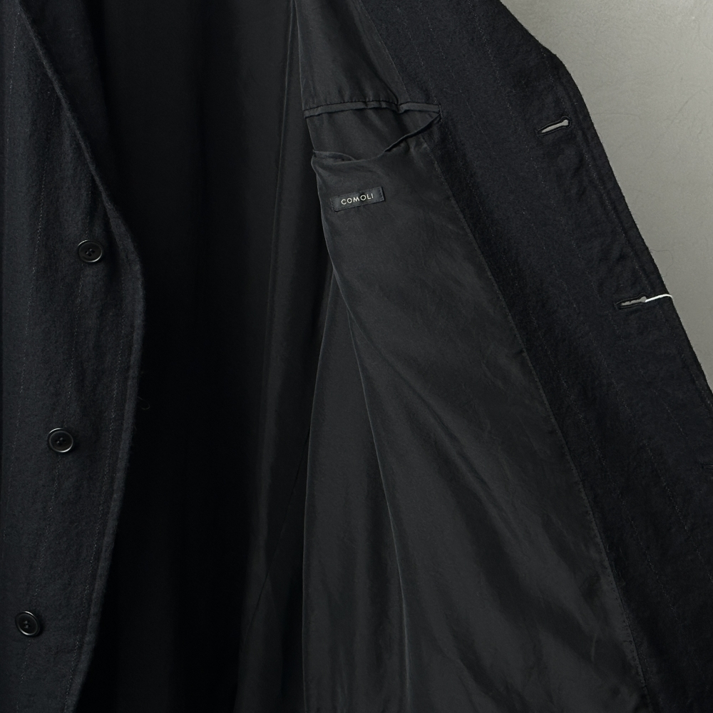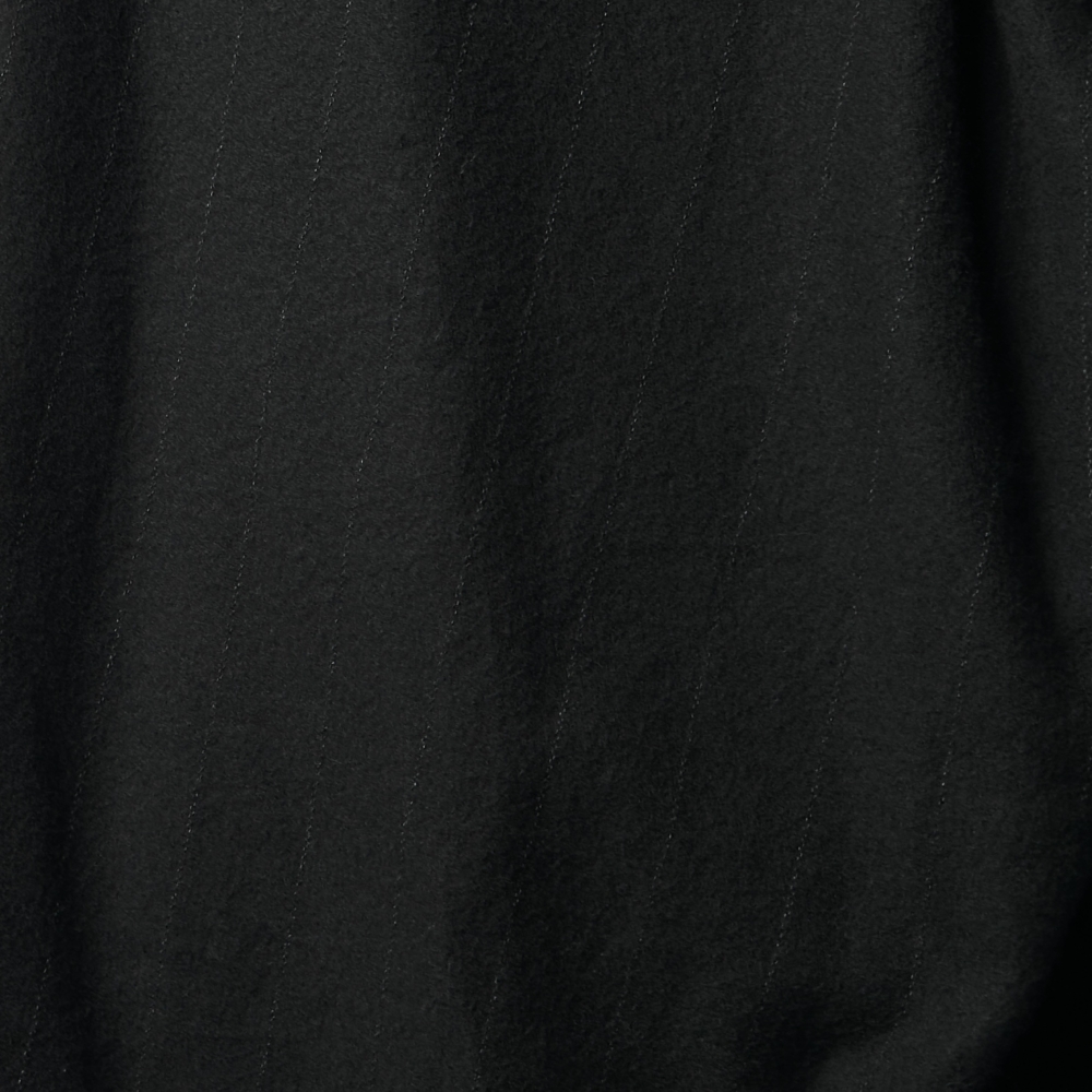 ムードのある生地感と独特のフォルムが印象的なストライプジャケット。サイズ2で3〜4相当のサイズ感と大ぶりな仕様ながら、テーパードの効いた同素材パンツとのセットアップは無二の雰囲気で、ブランドの今を体現するかのような存在感です。上質なカシミヤ86%にシルク14%という絶妙な混紡比の表地に、適度な張りを与えるシルク100%の裏地がボリュームバランスを保ち、ゆったり目に羽織って欲しいというデザイナーの意図が伝わってくるような仕様。ブラックベースに微かなホワイトストライプを残したやや厚みのある生地は、製品時にお湯洗いを施しているため非常に柔らかく、膨らみや毛羽立ちを特性としています。ストライプの間隔は広く、遠目に無地と見紛うほどですが、目を凝らすとそこにラインが滲んでくるようなニュアンスにCOMOLIらしさが溢れています。