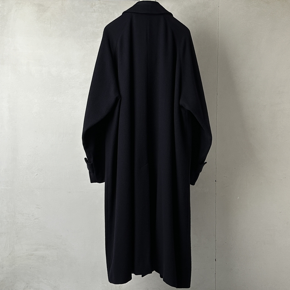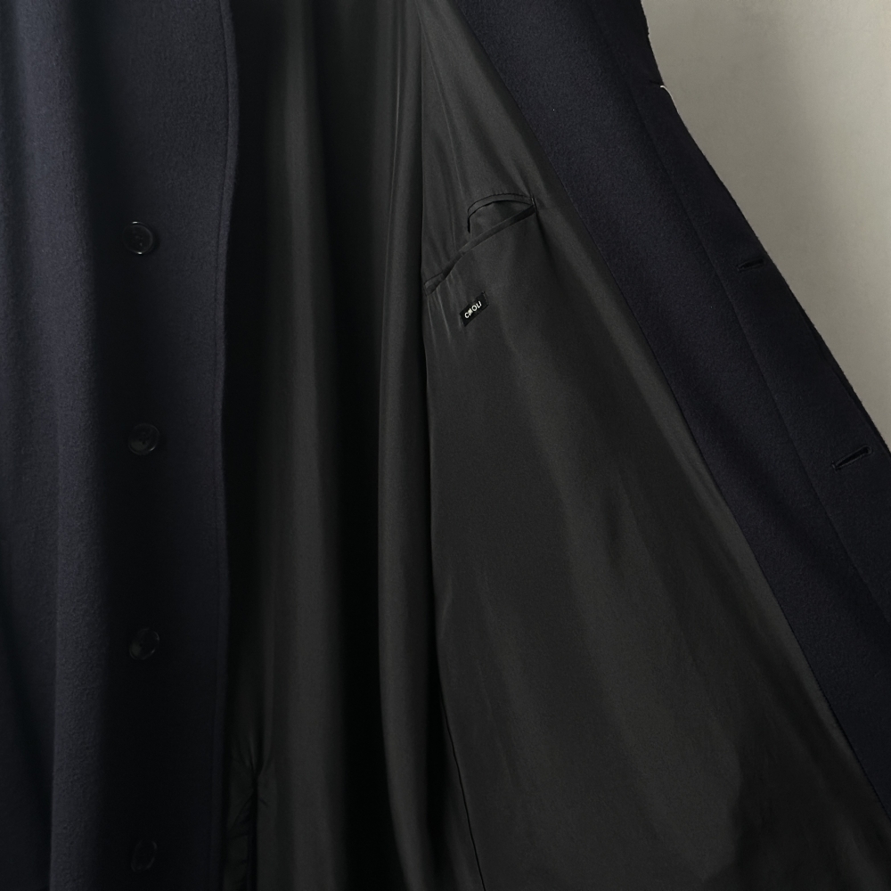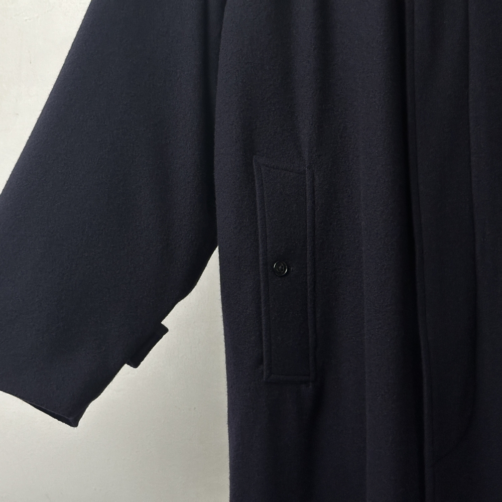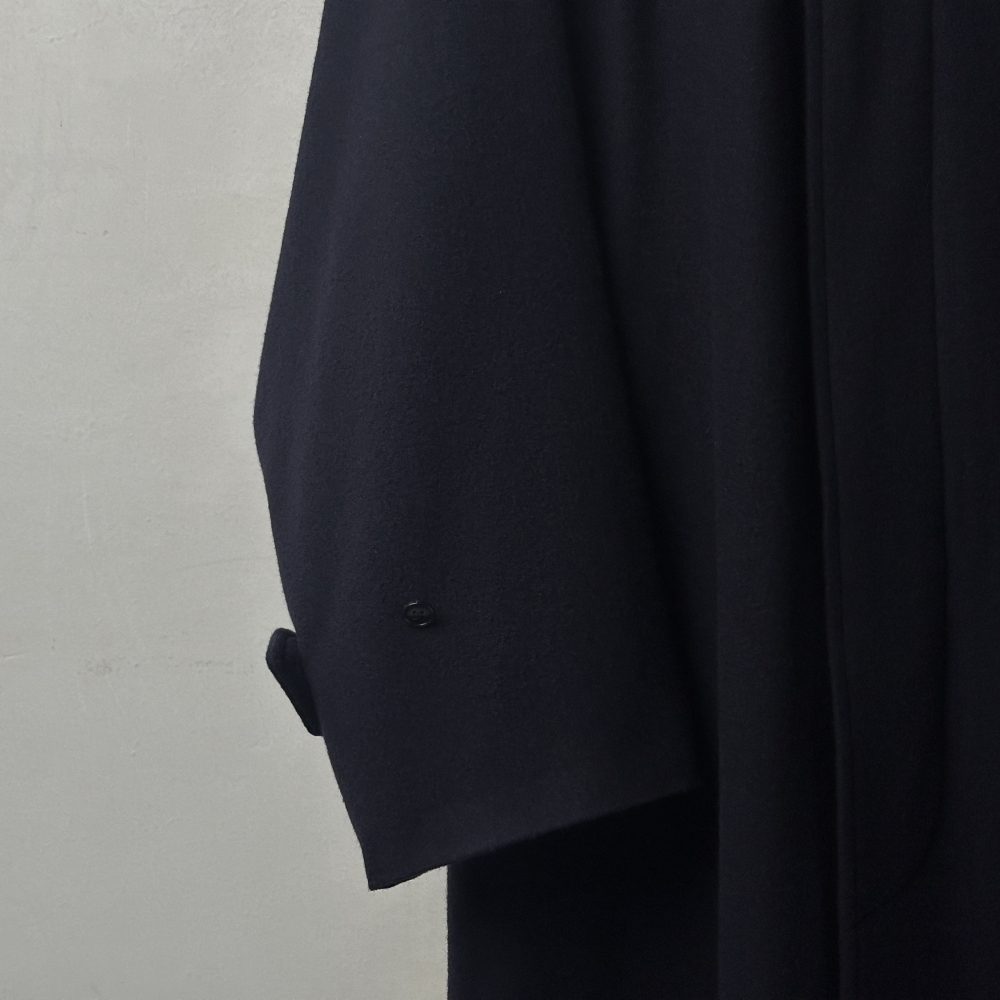 カシミヤシリーズから、クラシックなスタイルに欠かせないネイビーのバルカラーコートが展開。表地にはカシミヤ100%、裏地には総裏仕様でシルクが用いられ、まるで生地が自らなびくかのように軽やかで柔らかな着用感です。独特のドレープを伴う上質な生地感がAWのラインナップにおいても無二の表情を演出し、羽織るたびに気持ちを高揚させてくれます。身巾・袖巾はゆったりと広く取られながらも身体の動きに馴染んでバタつかず、暖かくしなやかに包んでくれます。ブランドのオーセンティックな一面が存分に表現されたアイテムでありながら、同素材のトラックジャケット・ドローストリングパンツとのセットアップに羽織り、大人のストリートスタイルを楽しむのがCOMOLIの提案。今期はネックウォーマーが首元をさらに表情豊かにしてくれそうです。グレイッシュな冬空の下をどこまでも歩きたくなるような、ムードのあるロングコートです。