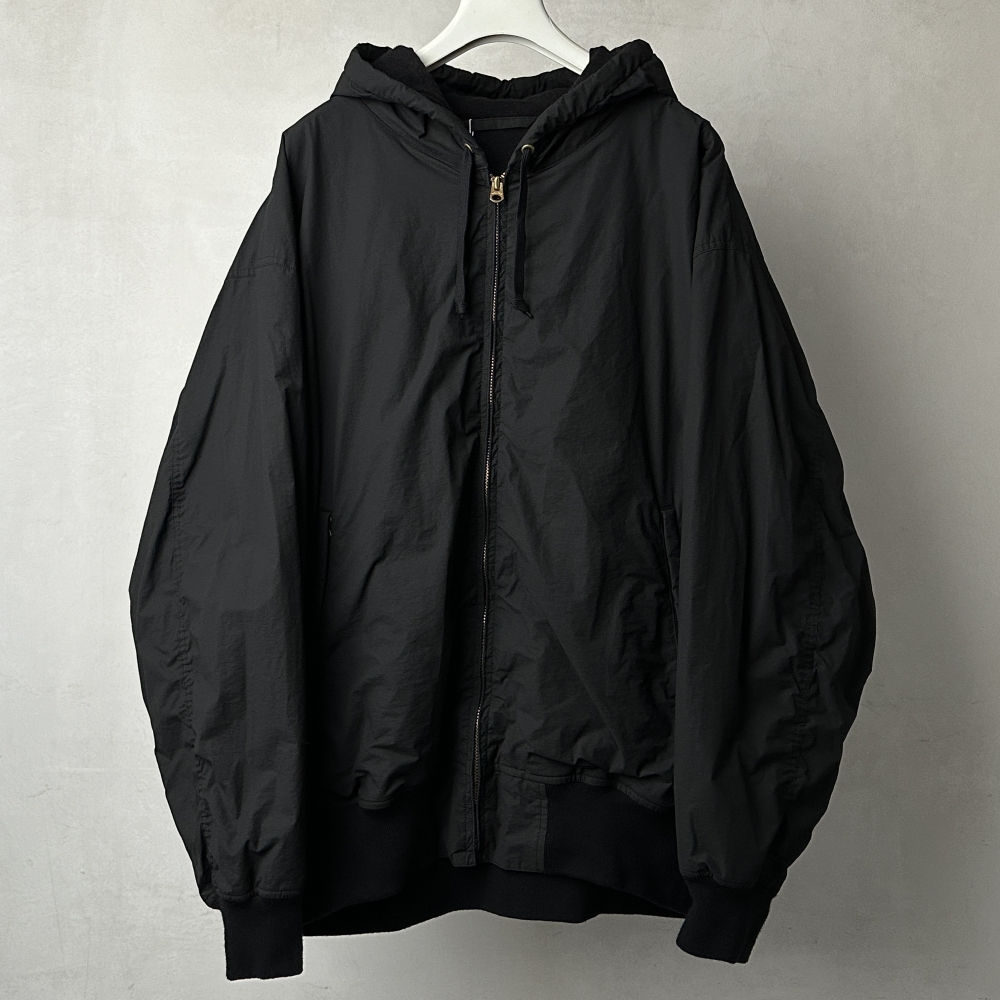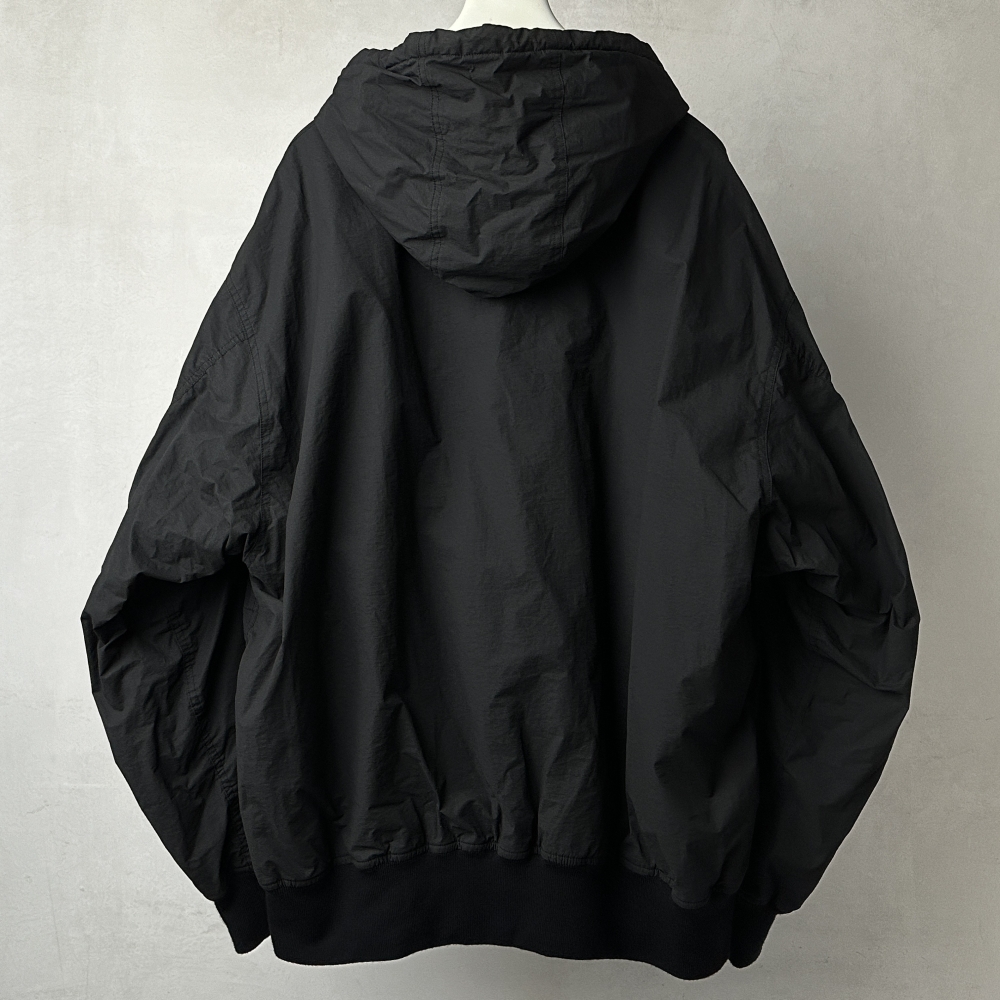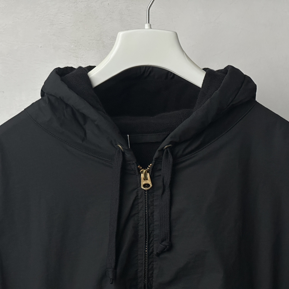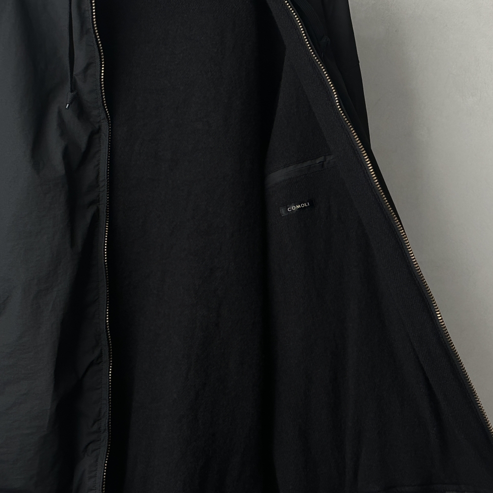 暖かく軽やかな着心地が印象的なジップパーカが継続して展開されています。パリッとドライな張り感のある表地に、フード裏まで柔らかなウールを貼り込んだ総裏仕様。墨黒のようなマットブラックのコットンナイロンが、着用の擦れによって艶やかに味わいを深めていく個性豊かなアイテム。製品洗いによって生じる表地と裏地の縮率差が、縫い目のパッカリングのみならず生地全体に動きを持たせ、粗野なムードを高めています。左右内側のジップポケットには手がすっぽりと入る秋冬ならではの実用性、フロントとハンドポケットに配されたゴールドジップにワークウェアのタフなムードが宿ります。外見のボリュームに反して重さを感じさせないCOMOLIのアウターには、シーンを選ばず取り入れたくなる魅力があり、都市部の移動のみならず、ドア・トゥ・ドアになりがちな郊外の生活者にとっても嬉しいところです。