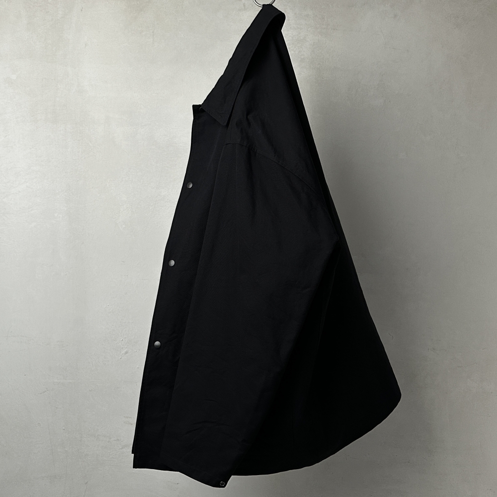 静かにAWシーズンの訪れを告げるワークジャケット。ディテールを抑えた穏やかで普遍的な面構えながら、開けて羽織ればレイヤードの広がりを、閉じてフォルムの妙を、所有者にその豊かな表現力で伝えてくれるアイテム。ドライな肌当たりと張り感が特徴のポリコットンにウールをブレンド、ほんのりと毛羽感のある上質な生地感に。裏地に貼り込まれたコットンネルは肌触り暖かな程良い厚みで、取り回しの良いスナップボタン仕様により外気のコントロールも容易です。不安定な気候に対応できる信頼感、着心地軽やかなパターンも手伝って、寒暖差の大きい季節にも小回りの利いた活躍が期待できます。同生地のポストワークツイル パンツとのセットアップだけでなく、ハーフコートのように様々なアイテムに合わせての単体使いも。移ろう価値観の中で寡黙であり続けるCOMOLIの力強い提案です。