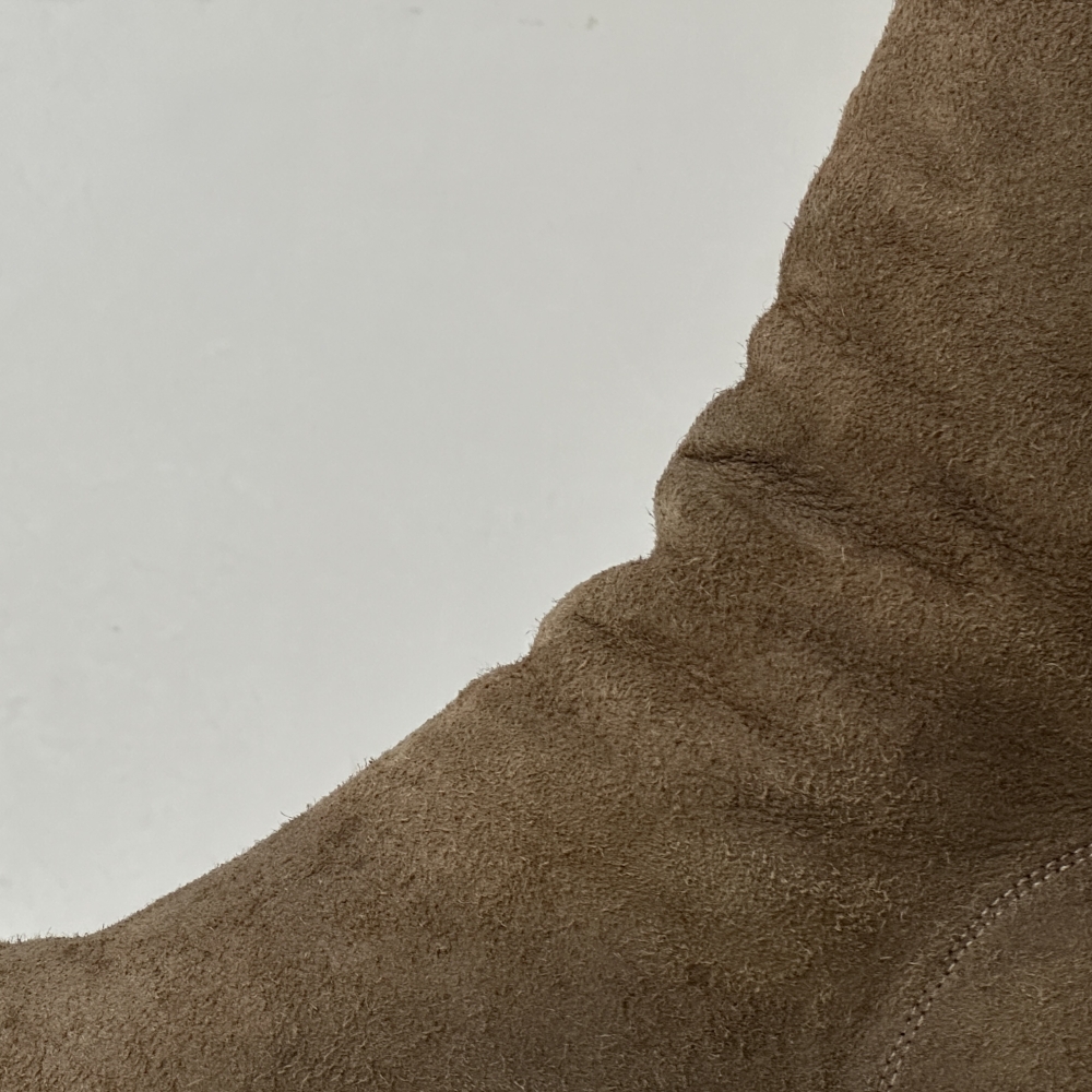 年月を経たようなラフな風合いとしなやかな表情が共存するバックジップブーツ。COMOLIのオーダーにより特別なベージュカラー仕様で展開されています。一枚革のカーフリバースをアッパーに採用し、タンブラーダイと自然乾燥によって色ムラや反り返りをも表現する無二の個性は、その抑制的なシルエットと共にブランドのラインナップにリズムを与えています。時と共に身体の一部になっていくような足首の装着感は履き込むほどに独特のリンクルを生み出し、コーディネートに深みを加えてくれます。ノルヴェジェーゼの特徴的な二重ステッチは堅牢性と信頼の証。黒いタンクソールのタフさもいっそ都市のアスファルトと地続きに馴染み、防滑性に優れ足元を支えるボリュームには安心感を覚えます。コットンドリルシリーズなど骨のあるアイテムにも合わせやすく、リリースタイミングに縛られずAWまでシーズンを通して多様なスタイルの基点に。GUIDIのアーティスティックな背景にCOMOLIの高い意識がリンクした、クリエイションの現在地を実感できる逸品です。