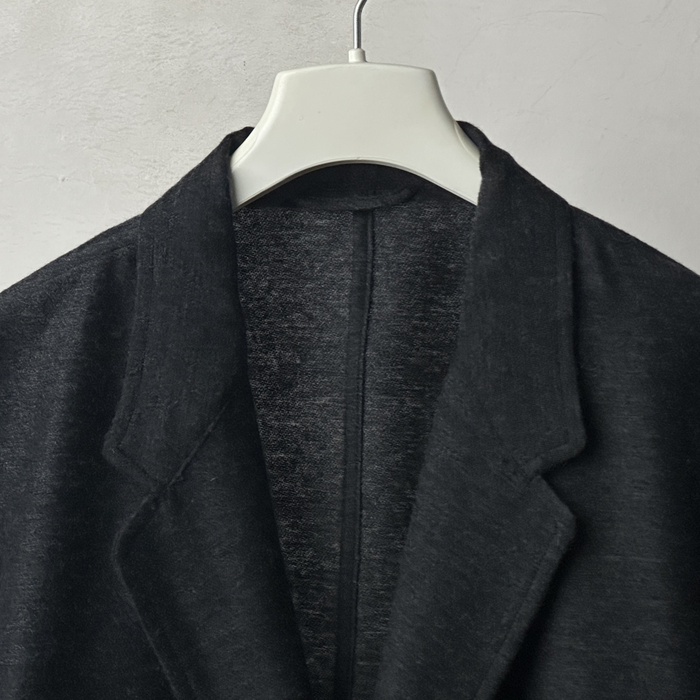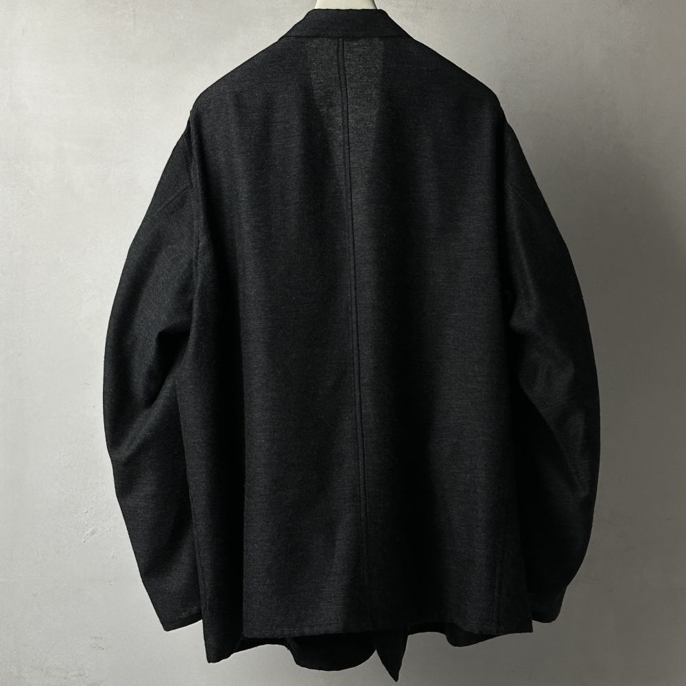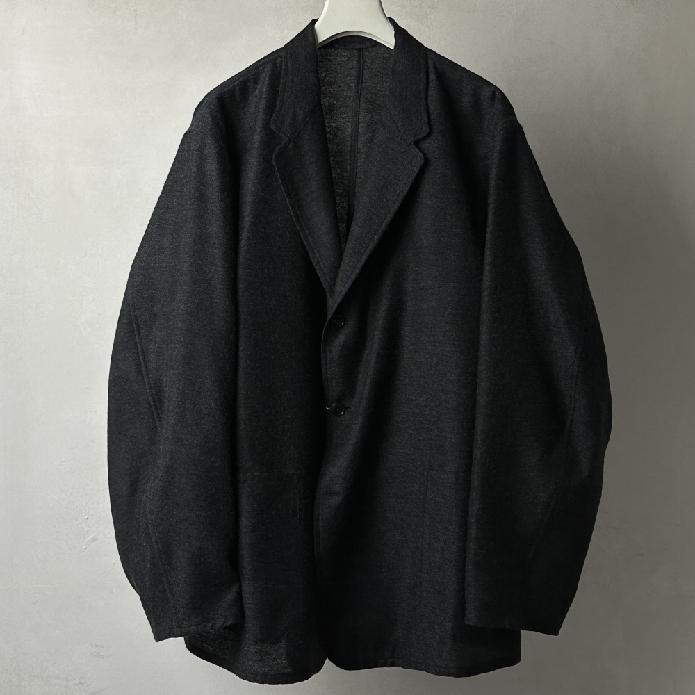素材を更新しながら展開される軽やかで上質なジャケット。近年はシルク糸のしなやかなテンションを活かしたカシミヤシルクで提案されています。COMOLIが好んで用いるシルク14%の組成が生地に絶妙な張りと強度を持たせ、身体に纏わりつかない快適さをもたらします。今期はシルクの張り感をやや弱め、カシミヤの柔らかさをより強く感じられる仕上がりに。立体的で柔らかなラペル、Tシャツの上から羽織っても様になるドレープの効いた表情は無二の存在感です。同素材で組むセットアップはもちろん、気負わずにタフなパンツに合わせて動きのあるシルエットを楽しみたいところ。ボリュームのあるコーディネートを想定し、size 1・2・3 はそれぞれ従来のジャケットにおける 2・4・6 相当のサイズ感に調整されています。