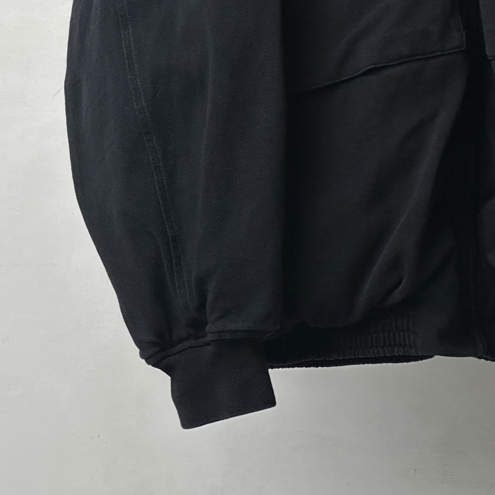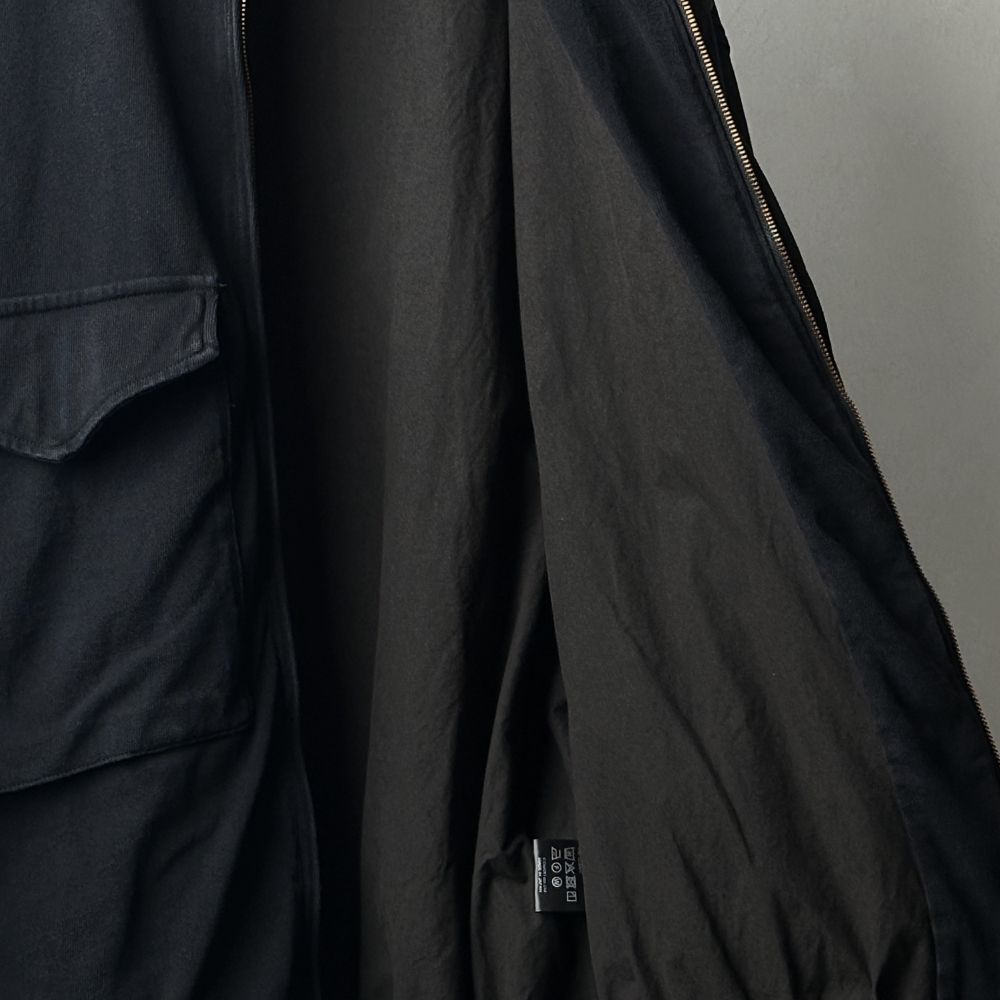 年月を重ねたような硫化染めの表情に心惹かれるG8ジャケット。SSでも展開されたヘビーウェイト天竺素材がAWにおいてもスタイリングの広がりに貢献しています。立ち上がりの良いスタンドネックが落ち感のあるシルエットを引き立て、総裏仕様で張り込まれた布帛が生地に豊かな量感を与えています。着用や洗濯を重ねることで枯れたようにフェードしていく生地感はドライな肌触りも心地良く、季節と歩調を合わせるかのように風合いを深めていきます。今期のルックにおいては同素材のニータックパンツとのセットアップが印象的で、晩夏から秋口の羽織りとしてデニムジップパーカと並ぶフックの効いたアイテムとなっています。
