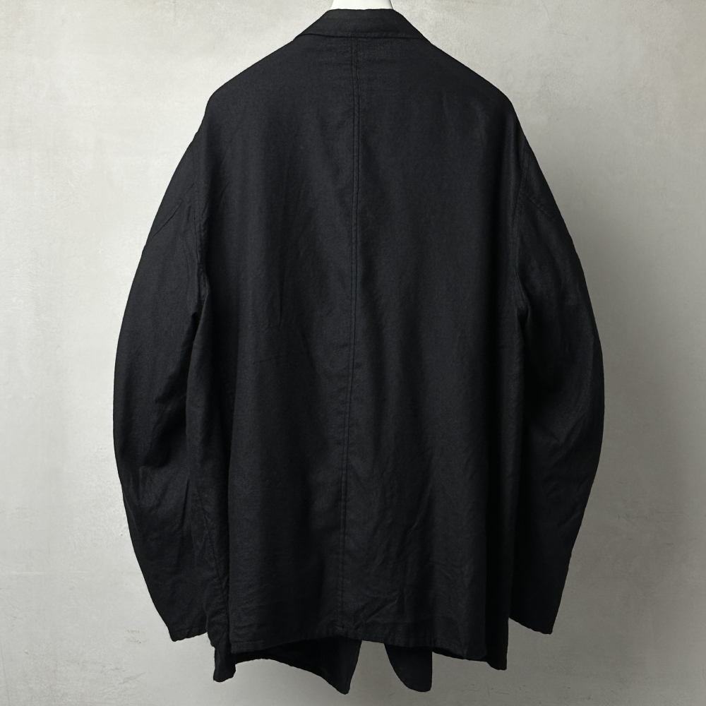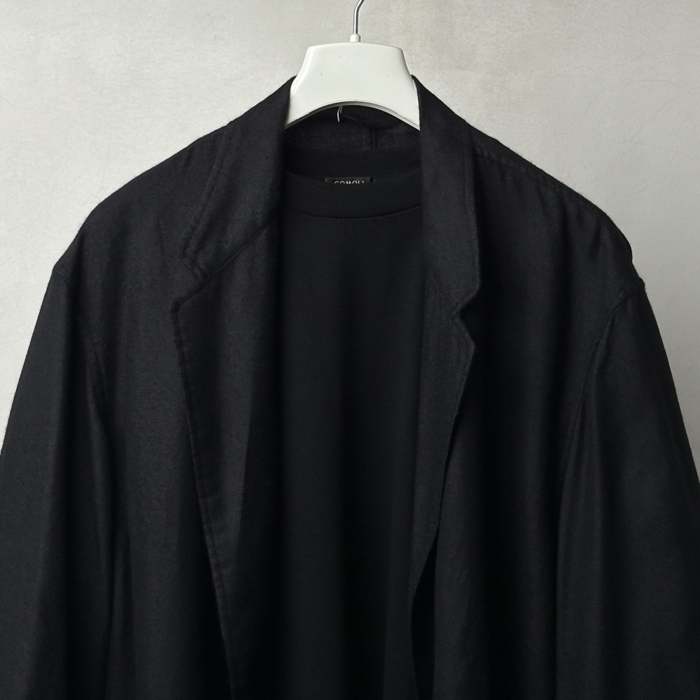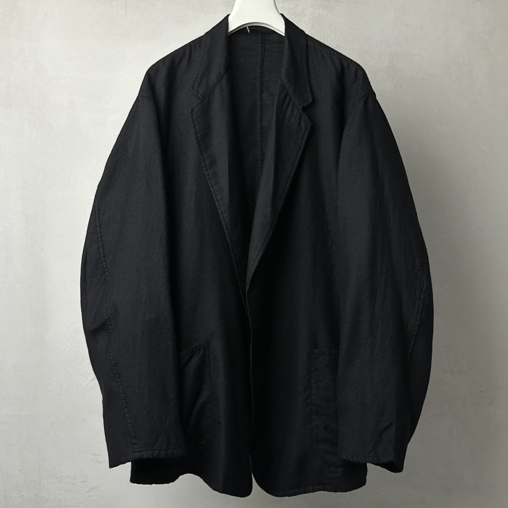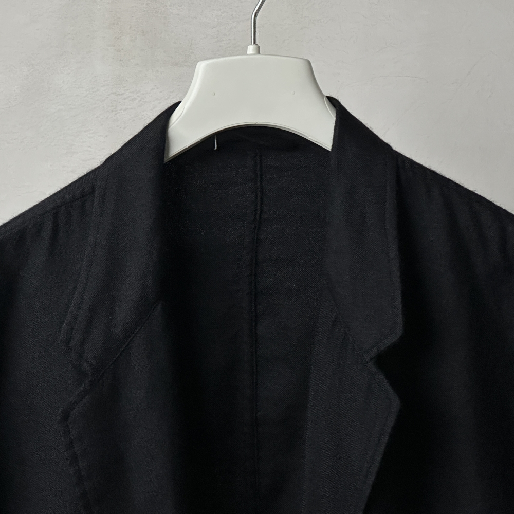 ディテールの抑制がムードを高めるカシミヤシルクのジャケット。フロントボタン・胸ポケットと構成要素を削ぎ落としながらも、色・形状・素材感のいずれもがCOMOLIという個性の基本形を示しているかのようです。ブラックカラーの製品染めを施されて一段と表情を深めたダークネイビーは、ブラックトーンのコーディネートにも穏やかに馴染むグラデーションに。通常はニットに用いられる糸を採用して張りを抑えた柔らかな生地感、どこまでも気配の曖昧なラペルとアンコンの軽やかな仕立てが、一枚の布地をふわりと纏うようなリラックスした着心地をもたらします。素朴なパッチポケットや大見返しの寡黙な内ポケットを備え、羽織りとしての確かな機能性と、デザイナーの生地に対する真摯なアプローチを実感できるアイテム。普段よりゆったりめのサイジングを意識して羽織っていただくと良い雰囲気が出せそうです。今期よりセットアップを意図して同生地のパンツがラインナップに追加されています。