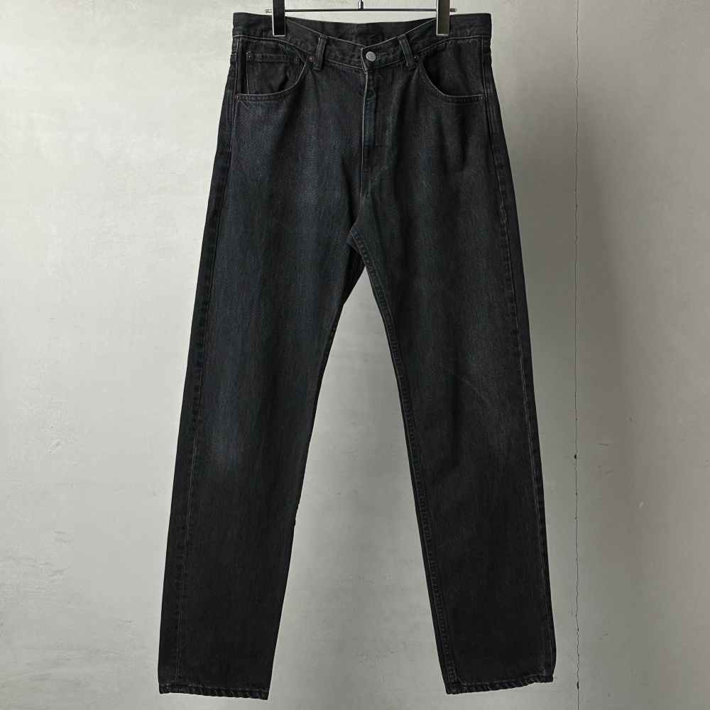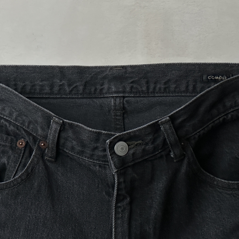 フェードブラックが印象的な細みのデニムパンツ。欧州でスナップされる何気ないコーディネートのような、リアリティの感じられるウォッシュドカラーの匿名性こそがCOMOLIの提案するレギュラーの魅力。膝下から裾にかけてややテーパードさせたフォルムがコーディネートに変化をもたらし、今まで愛用していたトップスがたちまち鮮度を伴って立ち上がってくるようです。穿き込んだ個体のサイドシームに見られるような膝上からのアタリの変化も、まるで初めからそうであったかのように自然に機能しています。何気ないチャコールのウールクルーネックやスコット&チャーターズのナチュラルなクルーネックに溶け込ませ、ロングコートやブラックデニムジップパーカー、足元にはブーツを合わせて秋冬のスタイリングを楽しみたいアイテム。新しく生み出される普通、作為的な無作為を楽しむ特別な体験です。