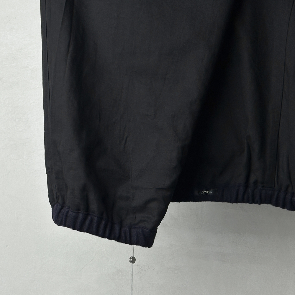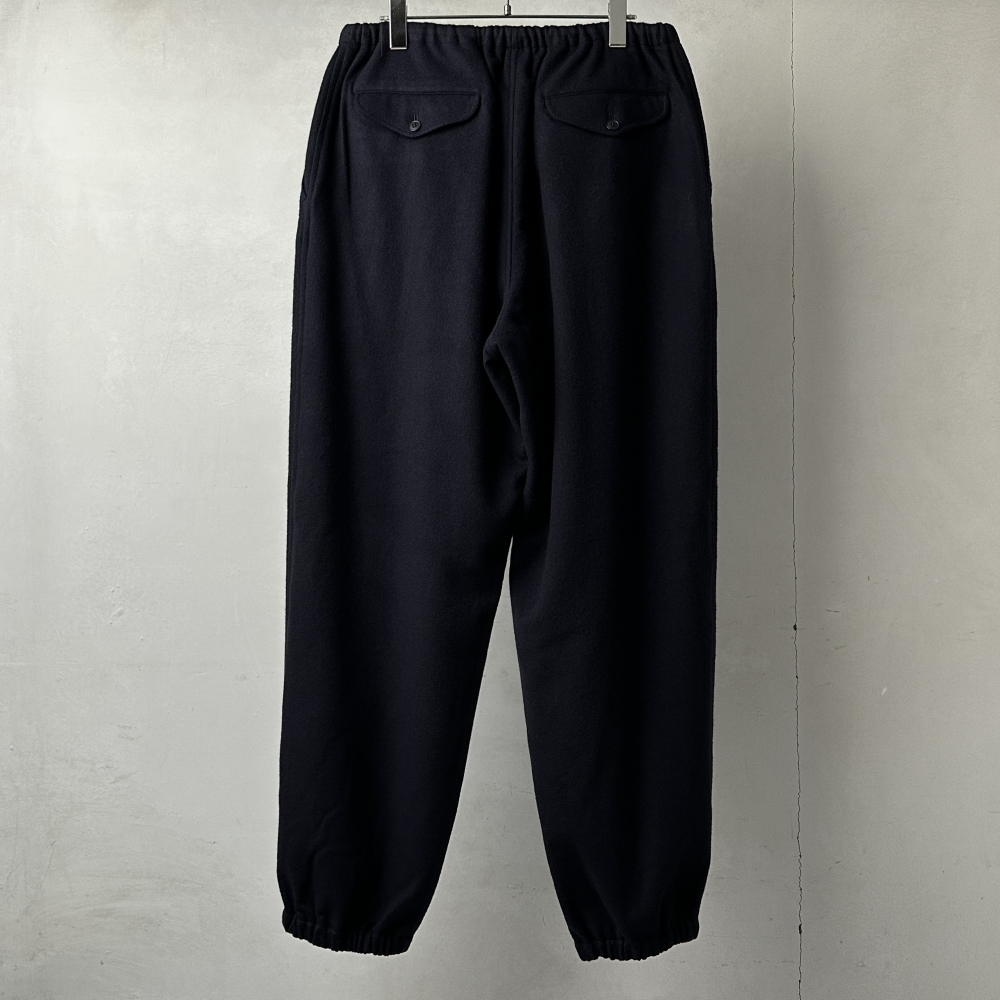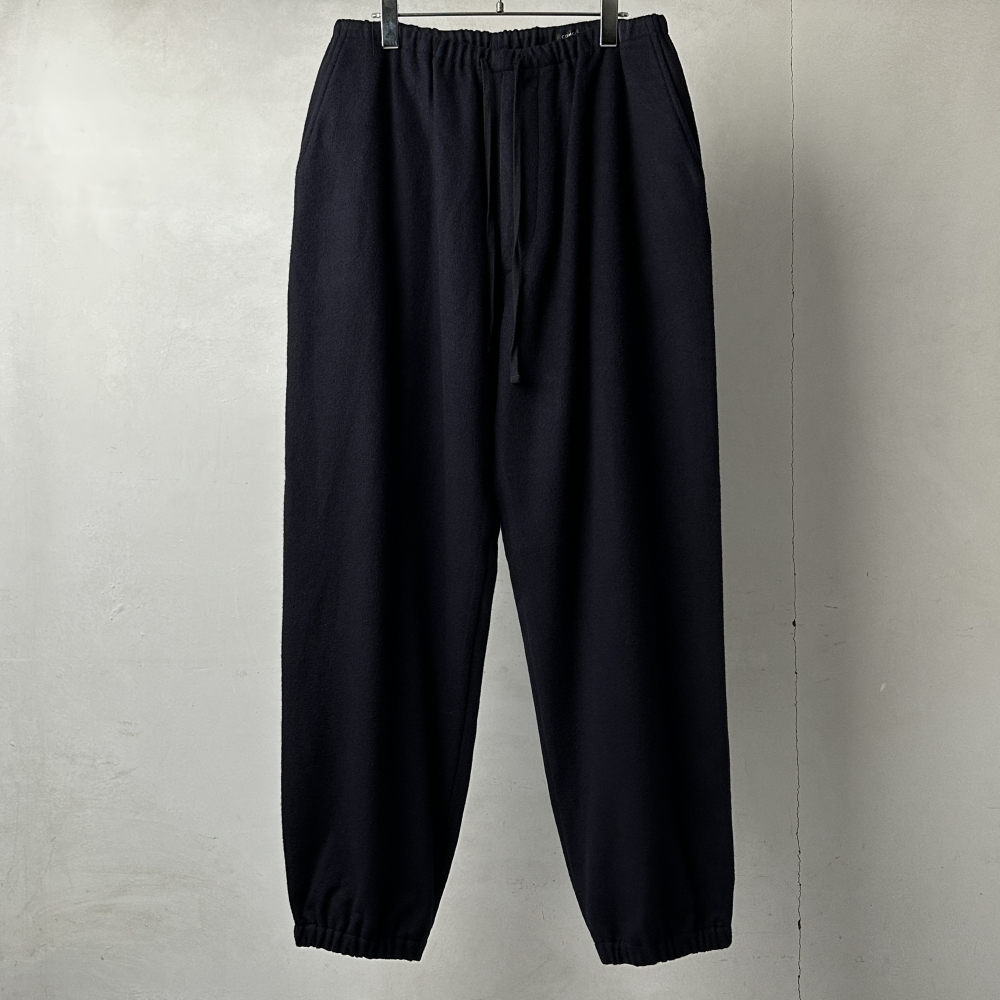 AWシーズンに展開されるカシミヤシリーズの中核となるドローストリングパンツ。ブラックカラー基調のシーズンにおいてもダークネイビーは確かな存在感をもってラインナップを彩ります。柔らかく量感のある表地はカシミヤ100%、裏地には総裏仕様でコットンを配して静かにアップデート。暖かさと共に豊かなシルエットが保たれやすく、3シーズン活躍してくれる頼もしさのある仕上がりです。ラフなトレーニングウェアを品格のある素材で表現したCOMOLIらしいアイテムは、オーセンティックな物作りへの確かな姿勢と世界観の奥行きを感じさせてくれます。脚を通して得られる高揚感・充実感はこの素材特有の格別な体験。スウェットスタイルからワンステップ上げた大人の日常着として、シーズンに合わせて鮮度のあるコーディネートが楽しめます。同色のカシミヤトラックジャケットとのセットアップにカシミヤバルカラーコートを羽織って、大人のストリートスタイルを。