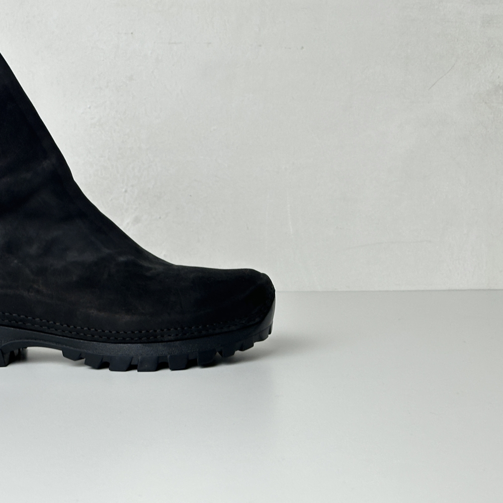 モダンなフォルムを趣のある素材で包み込んだレザーブーツ。黒漆喰のような鈍い湿度を漂わせたブラックヌバック仕様で展開されています。GUIDIのインラインVS01をベースとしたCOMOLIのオーダーは、ホースヌバックとバックジップによる寡黙な個性。アッパーをアウトソールに被せて縫い付ける製法がミニマルでフェティッシュなシルエットを演出しています。ビブラムロゴに付着する染料にその名残を残すタンブラーダイによって独自の色世界が表現され、ラインナップにリズムを与えています。タイトな装着感のシャフトは履き込むほどに身体の一部のように馴染み、特徴的なリンクルで世界観に深みを加えます。GUIDIのアクティブなカテゴリ Bristol Sole はスニーカーとブーツを融合させたような履き心地の良さ。踵のクッションが都市のアスファルトに好適な、軽量で歩きやすいソールとなっています。モールスキンや縮絨など質感豊かなアイテムにも合わせやすく、シーズンを通して多様なスタイルの基点に。COMOLIの感度を形にするGUIDIのアーティスティックなクリエイションを実感できる逸品です。