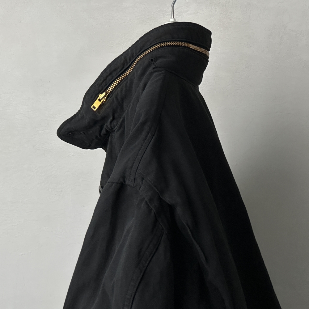 曇り空の似合うフィールドジャケット。製品染めによるブラックカラーの枯れた風合いが乾いた空気と都市の情景に映える、寡黙にして存在感のある仕上がり。簡易フードを格納したブラスジップが印象的な大振りのスタンドカラー、袖の三角フラップ、両肩のプリーツ、そして裾と腰に配されたドローコード。M65のタフなムードを踏襲しながらも、ディテールを突出させることなく静かに調和させています。密度のあるコットンの張りを活かした表地とシャリっとした裏地の関係性が、奥行きのある表情と包容力のあるシルエットを生み出し、インナーを着込んで余裕のあるフィッティングに貢献。コットン裏毛スウェットクルーネックや裏毛パーカをベースに、様々なインナーとの組み合わせ次第で春・秋・冬と活躍してくれそうです。真冬にはカシミヤネックウォーマーで肌当たりも暖かく整えて、袖を通すたび肌に馴染んでいく風合いを楽しみたいアイテムです。
