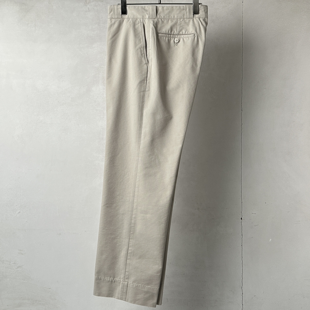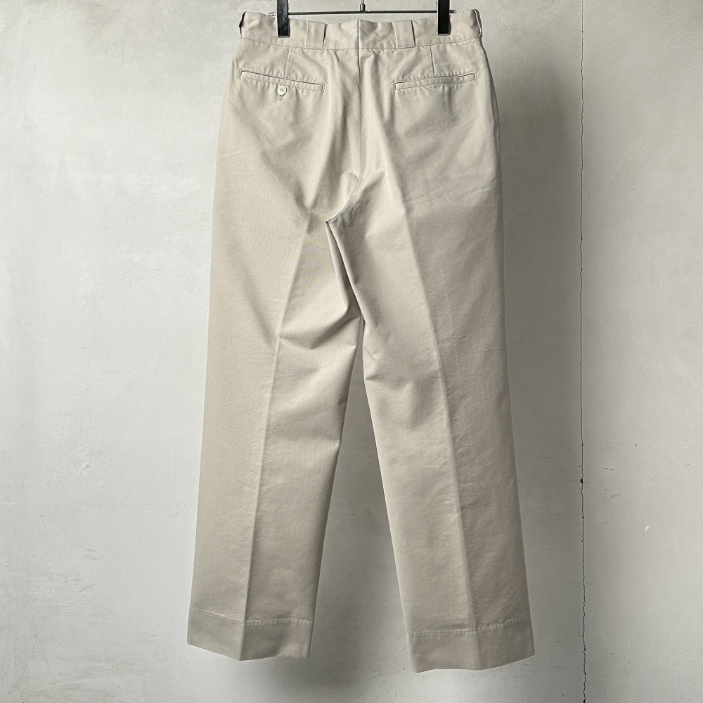 素材を変えながら継続展開される都会的なワークパンツ。ノスタルジックなアイボリーがツイル生地に鮮度を与えています。スラックスほどのカタさはなく、カジュアルにも振りすぎない絶妙な匙加減。ワタリに余裕を持たせたストレートシルエットは匿名性が高く、ラインナップにおいてはその普遍的な形状がむしろ印象的に映ります。コットン・ポリエステル・ウールが程よくブレンドされた表地はわずかに毛羽立ち、しなやかな張りが感じられる豊かな風合い。着用を重ねて洗い込んでいくことで、カサついた質感とアタリが出て味わいを増していきます。ブラックのコットンニットや5Gカーディガンのややルーズな雰囲気に合わせてスリーシーズン楽しめる汎用性の高さも魅力的。クラシックなピンループにそそられて脚を通せば、しなやかな穿き心地とパターンの妙に心が躍ります。