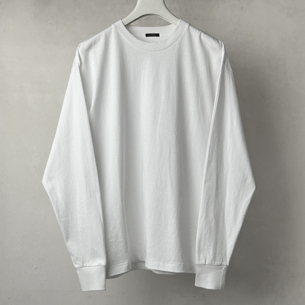 スタンダードな天竺編みの長袖Tシャツ。ダークカラーとの対比が映えるホワイトカラーの提案です。通年で使え、肌に一番近いCOMOLI。絶妙なサイズ感のベースレイヤーとして、またトップスとして一枚でもバランスの良いシルエットです。糸表面と内部で異なる撚りをかけて繊維間に空気を含ませた綿糸はさらりとしてドライな肌触りが魅力。簡単にはよれない頼もしさで、着用と洗いを繰り返すことで毛羽感のある柔らかな風合いへと表情を深めていきます。丸胴ならではの縫い付け処理の細やかな演出も味わい深く、愛着の湧く一枚になりそうです。