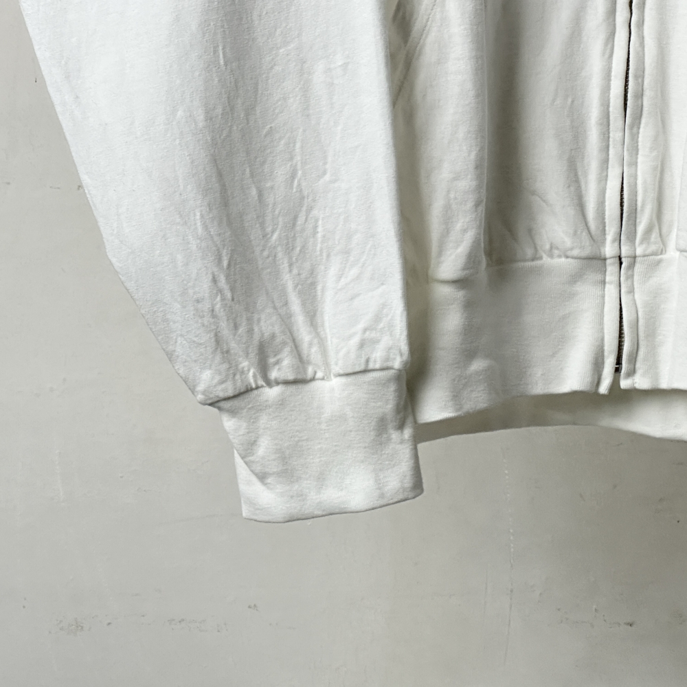 サープラスTシャツと同素材の軽やかなジップパーカ。空気をはらむような生地はドライで肌離れが良く、気温の高い時期にも取り入れやすい素材感。コットンジャージに輪を掛けてライトな着心地も印象的で、適度な落ち感がありながらもアウトラインに僅かな膨らみを感じる絶妙な仕上がりです。起伏も穏やかで気配の少ないフードが大人のパーカとしてのさりげなさを演出。ボディカラーに映えるシルバージッパーが最適な表情を引き出し、ブラックカラーに羽織れるホワイトとして、コーディネートにしっくりと馴染ませてくれそうです。同生地の半袖や長袖Tシャツと重ねて表情を付けたり、肩にかけても、腰に巻いても。気兼ねせず様々なシーンで着用できるデイリーアイテムです。
